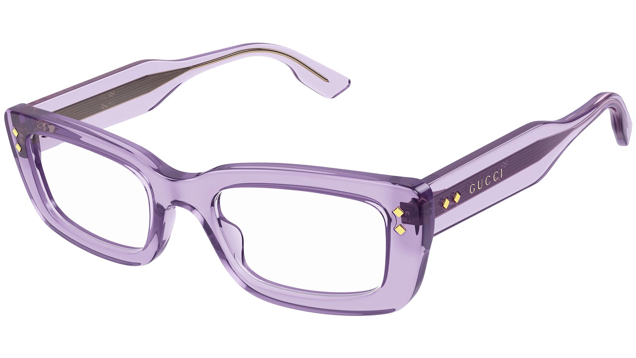 Occhiali da vista Gucci Logo modello GG1216O variante colore 003 viola lucido trasparente con astine color viola.