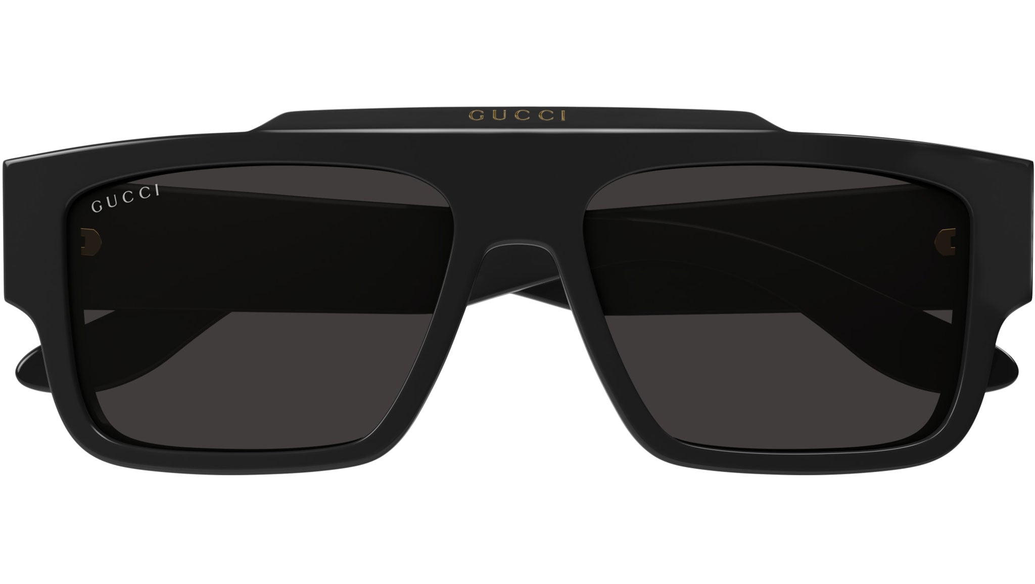 Occhiali da sole Gucci linea Lettering modello GG1460S 001 in acetato riciclato nero lucido tinta unita con aste color nero e lenti grigio tinta unita.