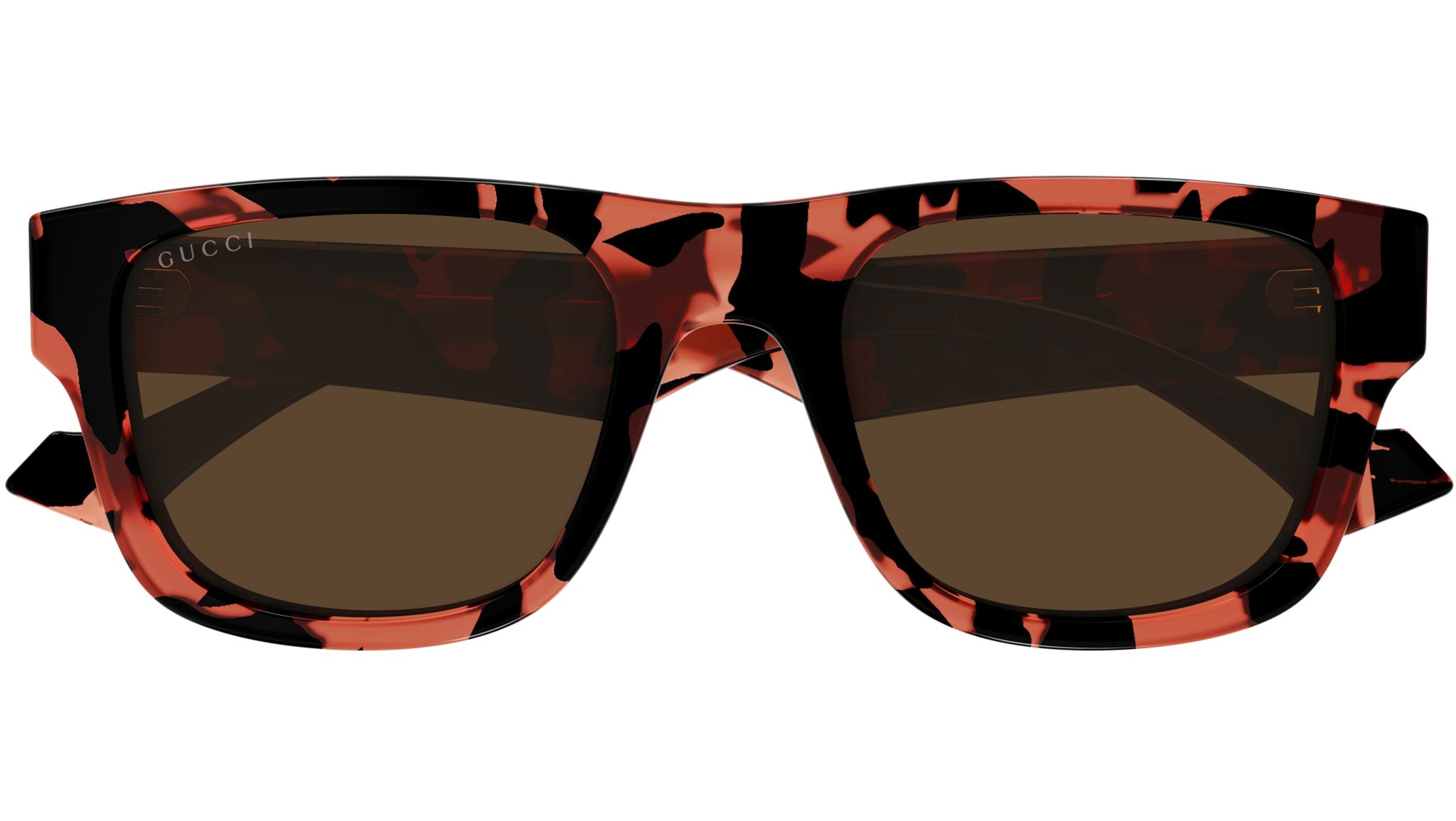 Occhiali da sole Gucci linea Lettering modello GG1427S 004 in acetato riciclato corallo striato maculato con aste color tartaruga e lenti marrone scuro tinta unita.