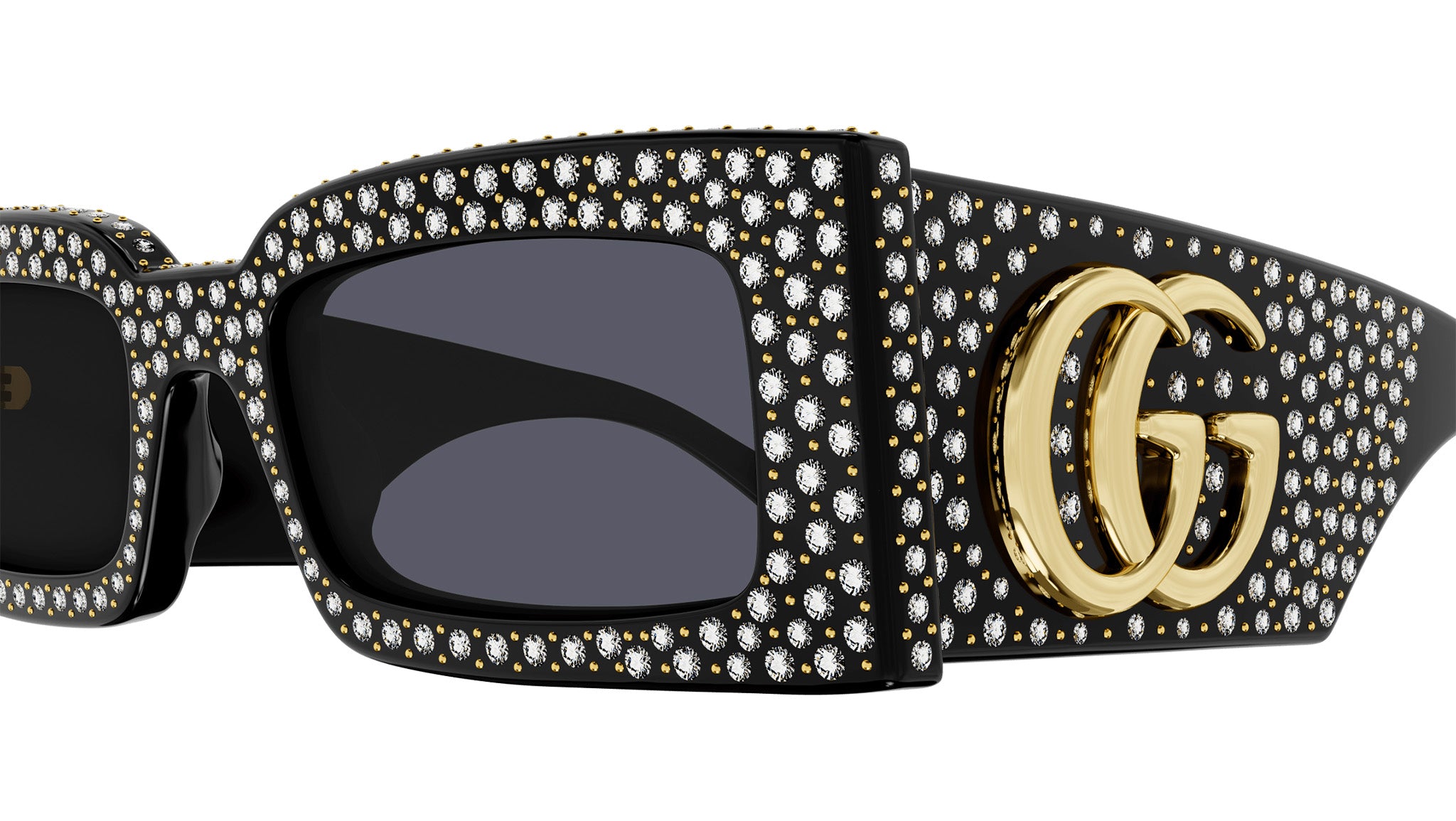 Occhiali da sole Gucci linea GG Logo modello GG1425S 005 in acetato riciclato nero tinta unita lucido con strass e borchie con aste color nero e lenti grigio tinta unita.