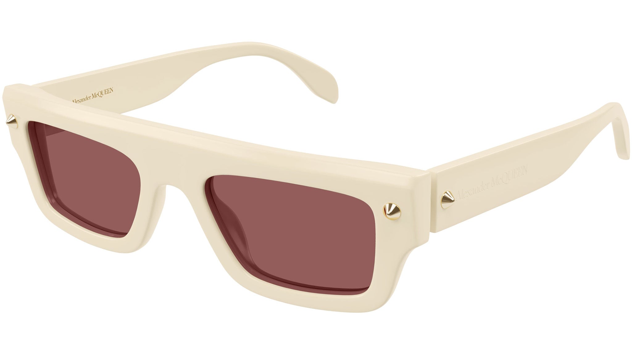 Occhiali da sole Alexander McQueen Icons modello AM0427S rectangle in acetato riciclato codice colore 004 avorio solido lucido con borchie in oro chiaro con aste avorio e lenti color marrone caldo tinta unita.