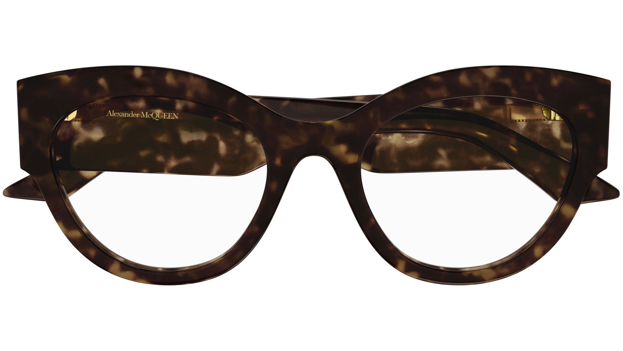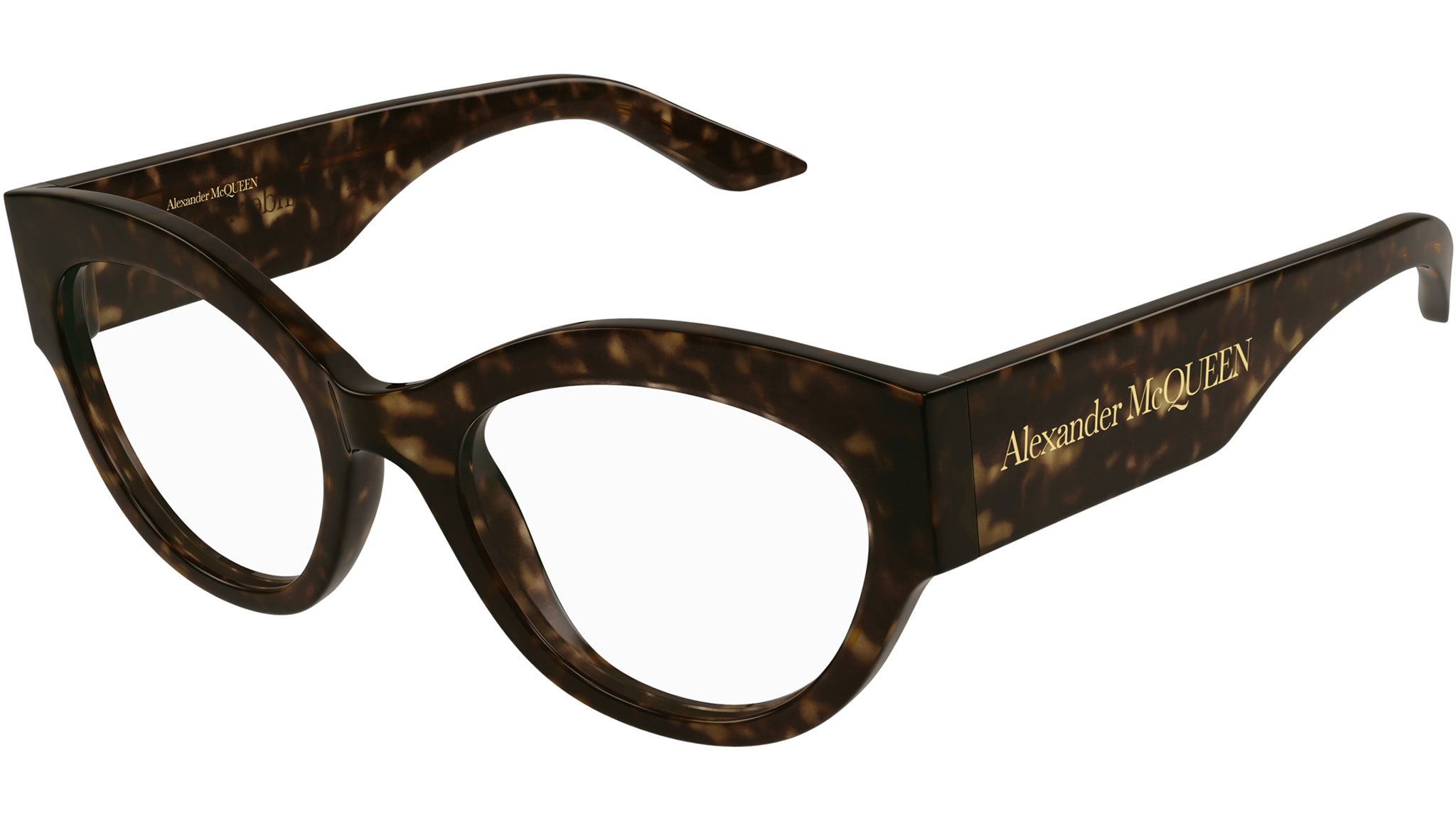 Occhiali da vista Alexander McQueen Casual Lines modello AM0435O cat eye in acetato riciclato codice colore 002 tartaruga scuro lucido con aste tartaruga e lenti demo.