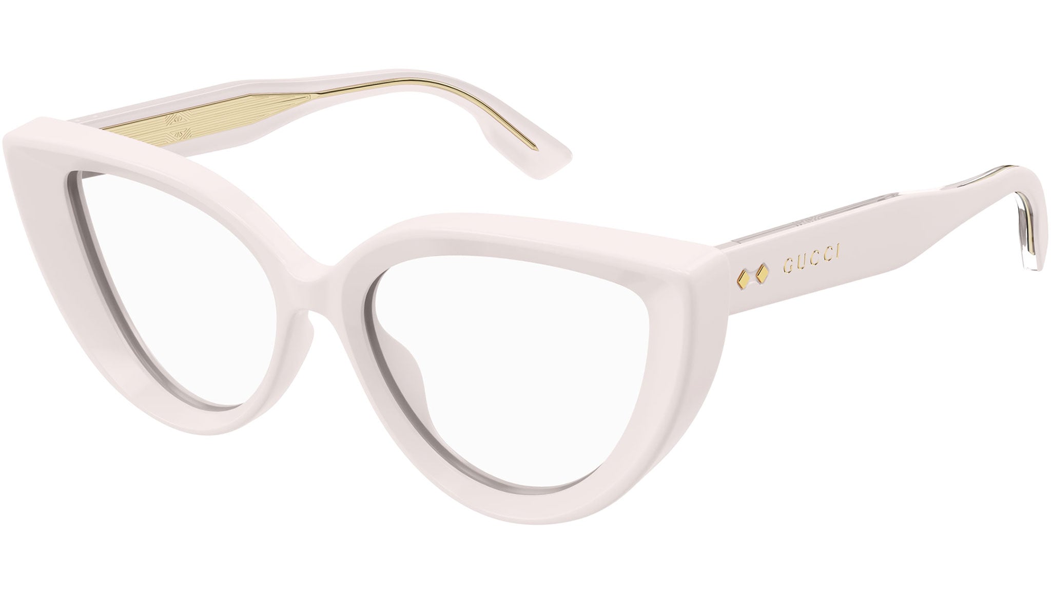 Occhiali da vista Gucci Rivets modello GG1530O cat eye in acetato riciclato codice colore 004 avorio tinta unita lucido con astine avorio e lenti demo.