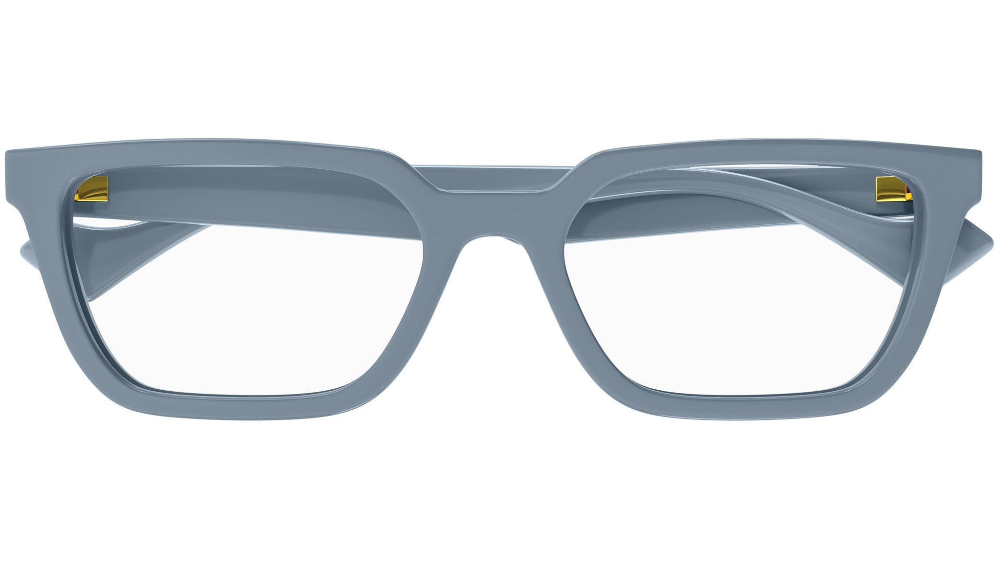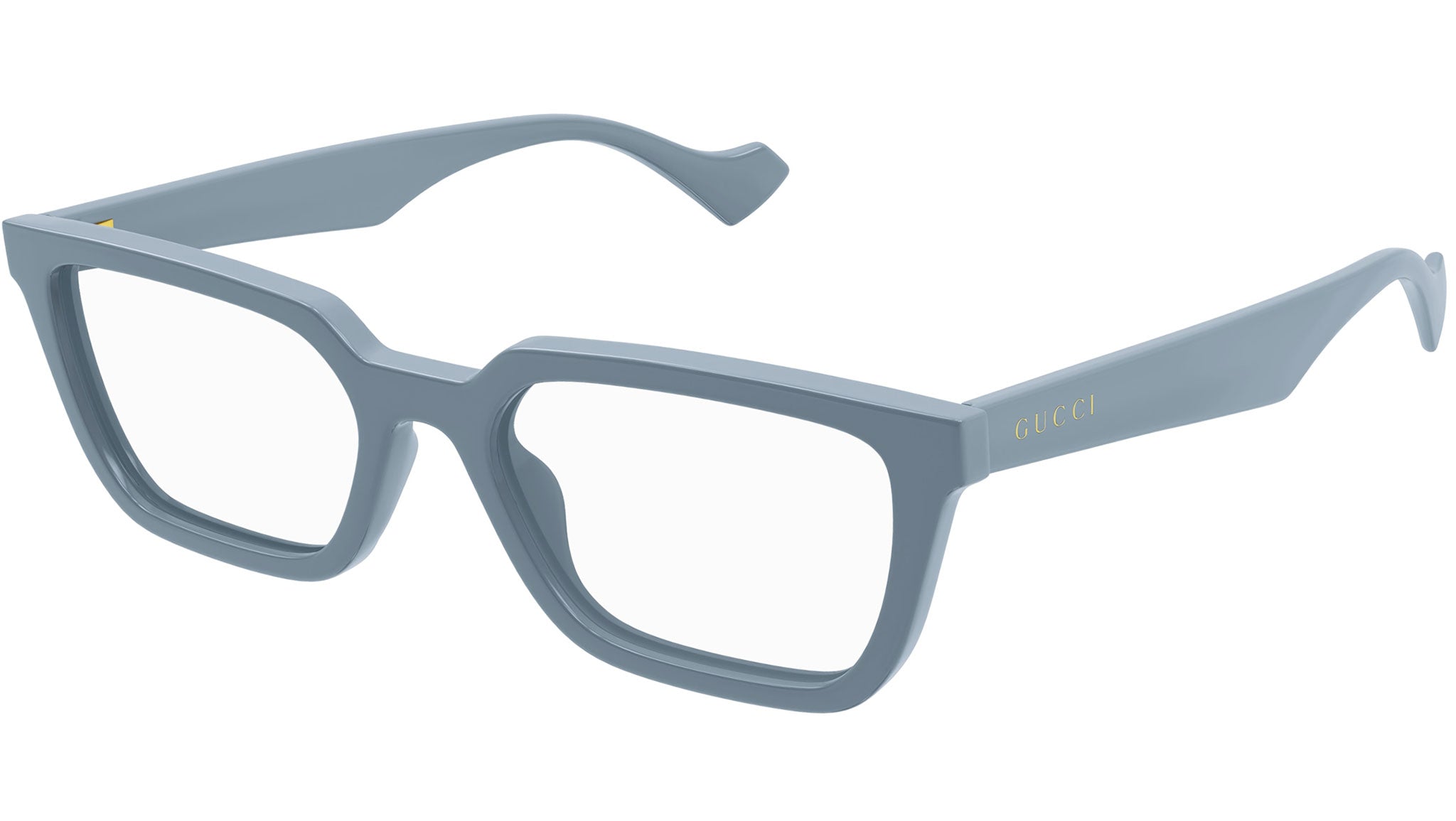 Occhiali da vista Gucci Lettering modello GG1539O rettangolari in iniettato codice colore 003 blu chiaro polveroso solido lucido con astine azzurro e lenti demo.