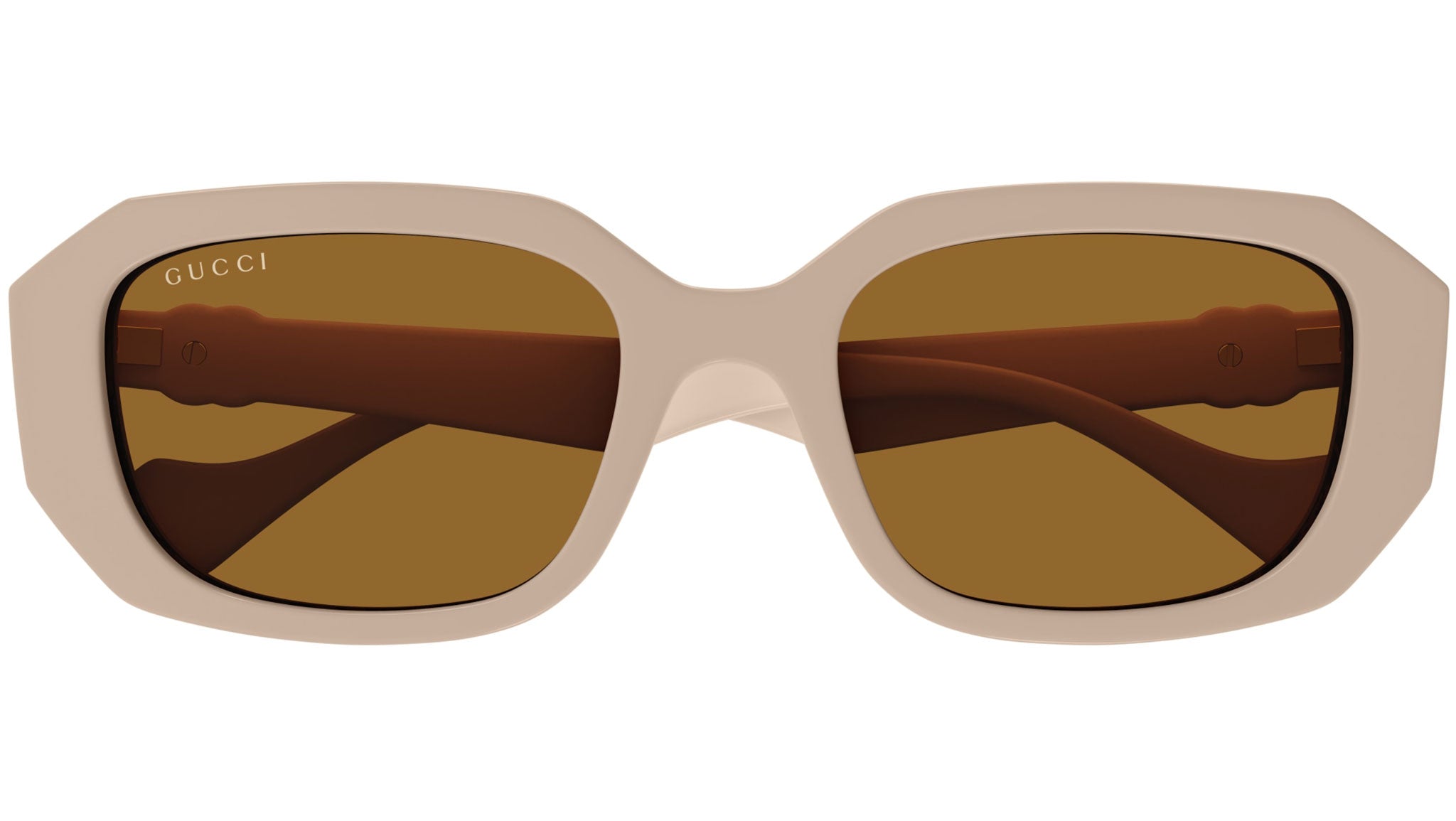Occhiali da sole Gucci linea GG Logo modello GG1535S rettangolari in iniettato codice colore 003 beige nudo solido lucido con aste beige nude e lenti color marrone ruggine solido.