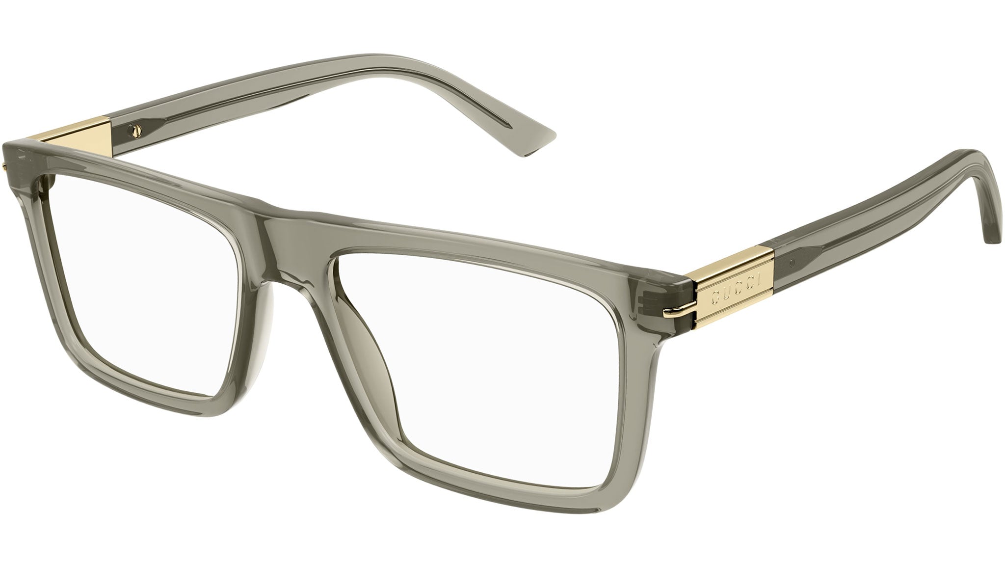 Occhiali da vista Gucci Web modello GG1504O rettangolari in acetato riciclato codice colore 004 tortora trasparente lucido con astine marrone e lenti demo.
