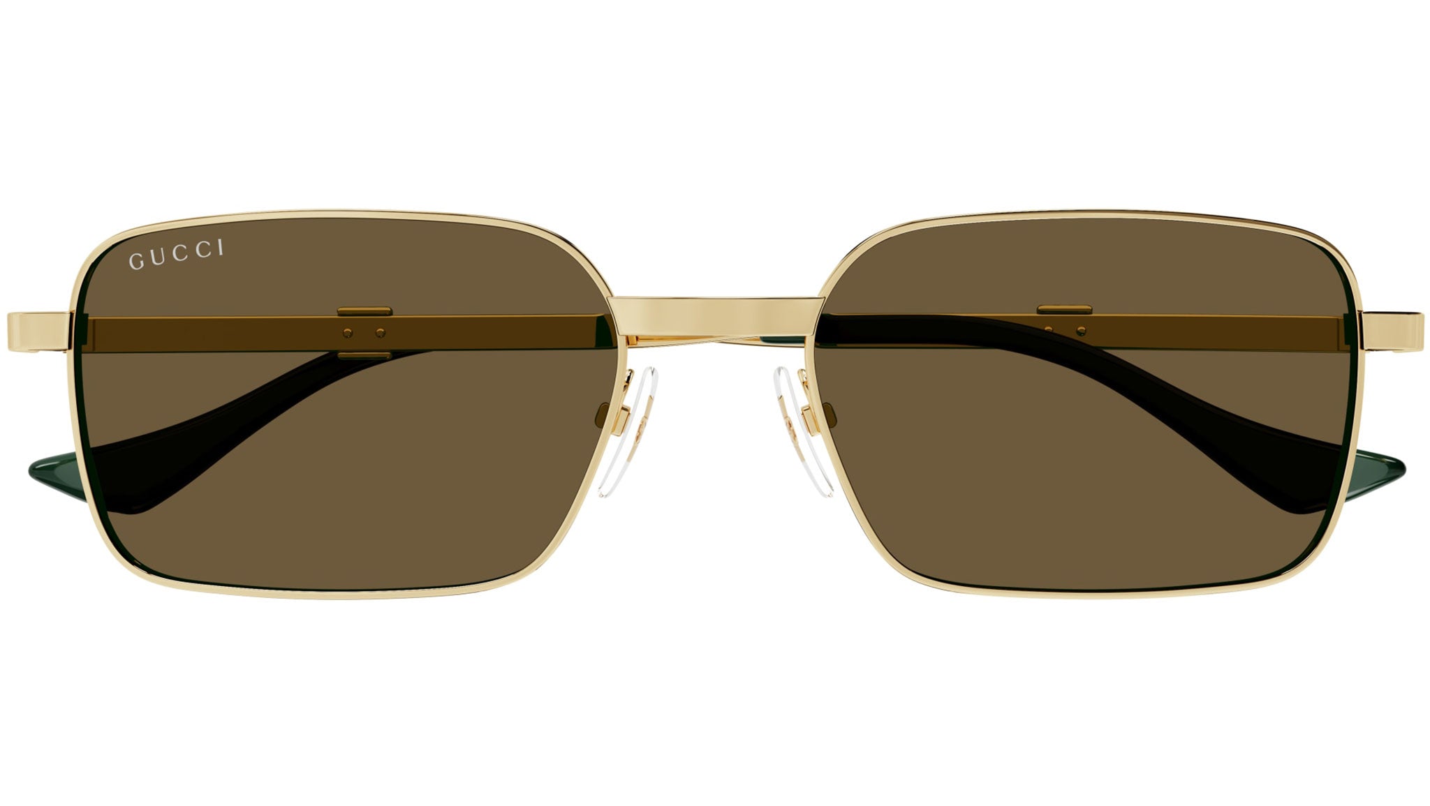 Occhiali da sole Gucci linea Web modello GG1495S rettangolari in metallo codice colore 002 oro endura lucido con aste oro e lenti color beige nicotine tinta unita.
