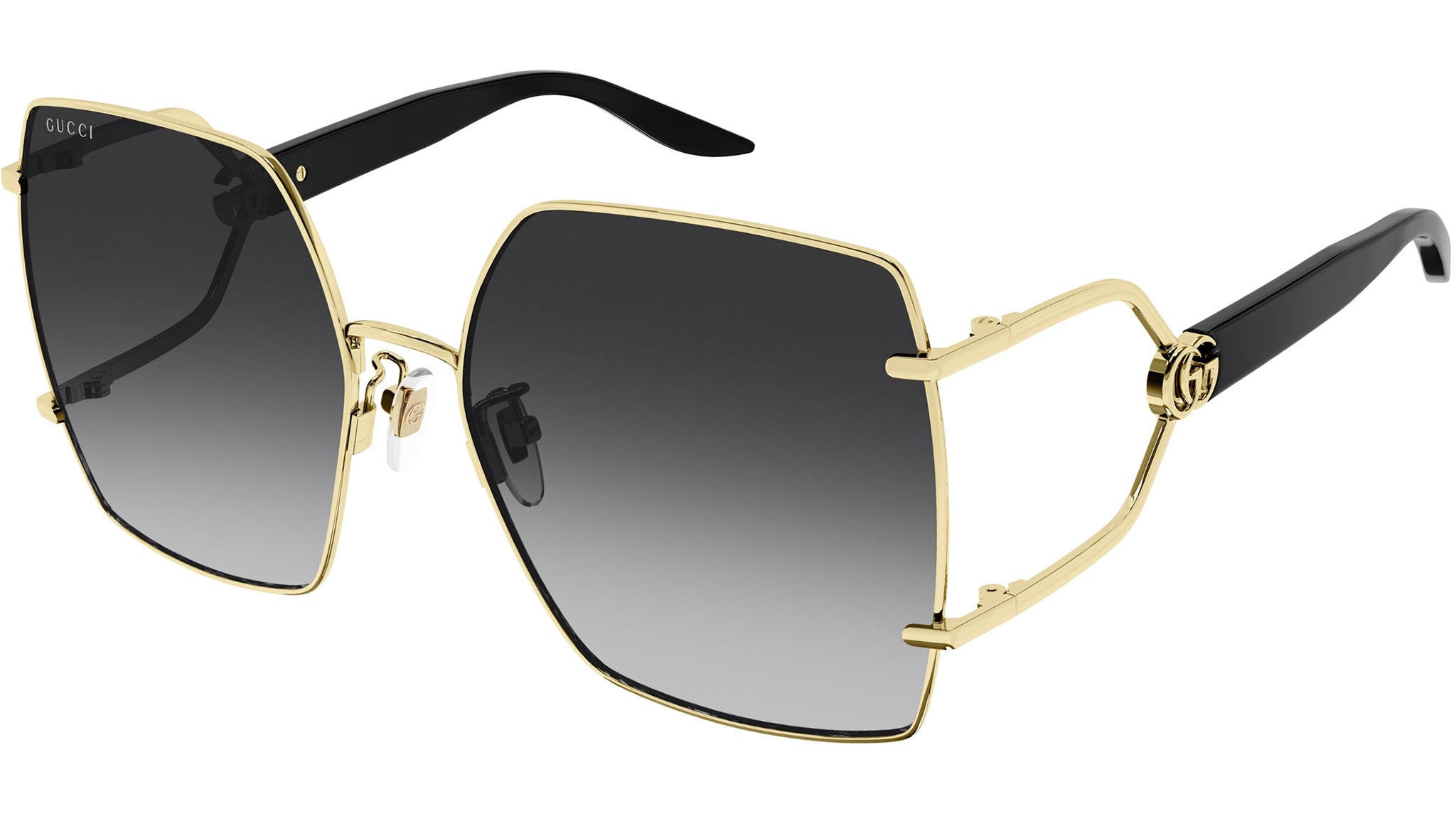 Occhiali da sole Gucci linea Fork modello GG1564SA rettangolari in metallo codice colore 001 oro endura lucido con aste nero e lenti color grigio sfumato.