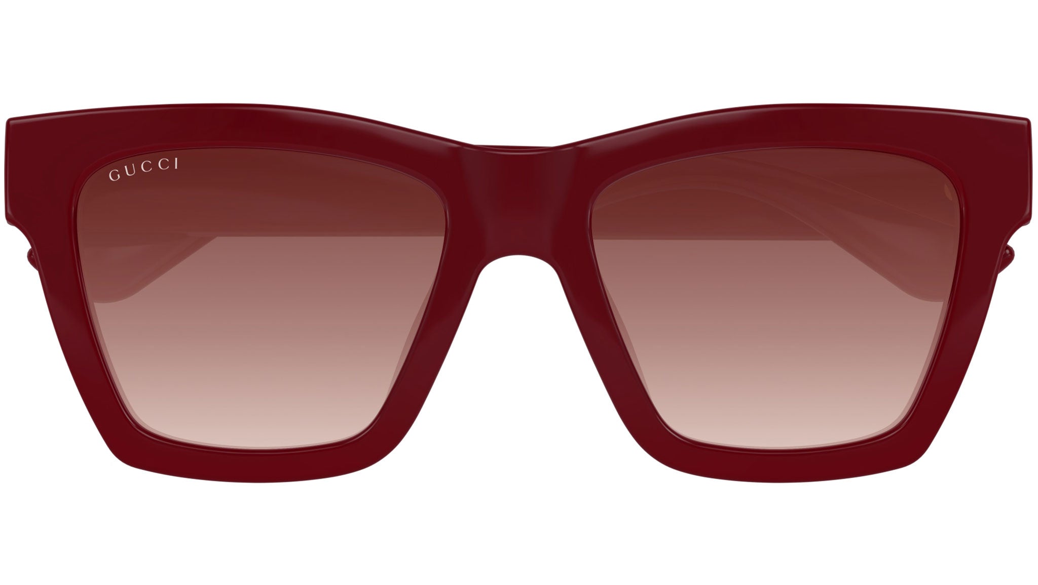 Occhiali da sole Gucci modello GG1714S linea GG Logo in iniettato forma a gatto codice colore 003 bordeaux tinta unita lucido con aste rosso borgogna e lenti doppia sfumatura bordeaux / rosa. Rivenditore autorizzato Gucci online. Gli occhiali vengono consegnati con custodia e accessori originali e sono coperti dalla garanzia ufficiale di 12 mesi del produttore.