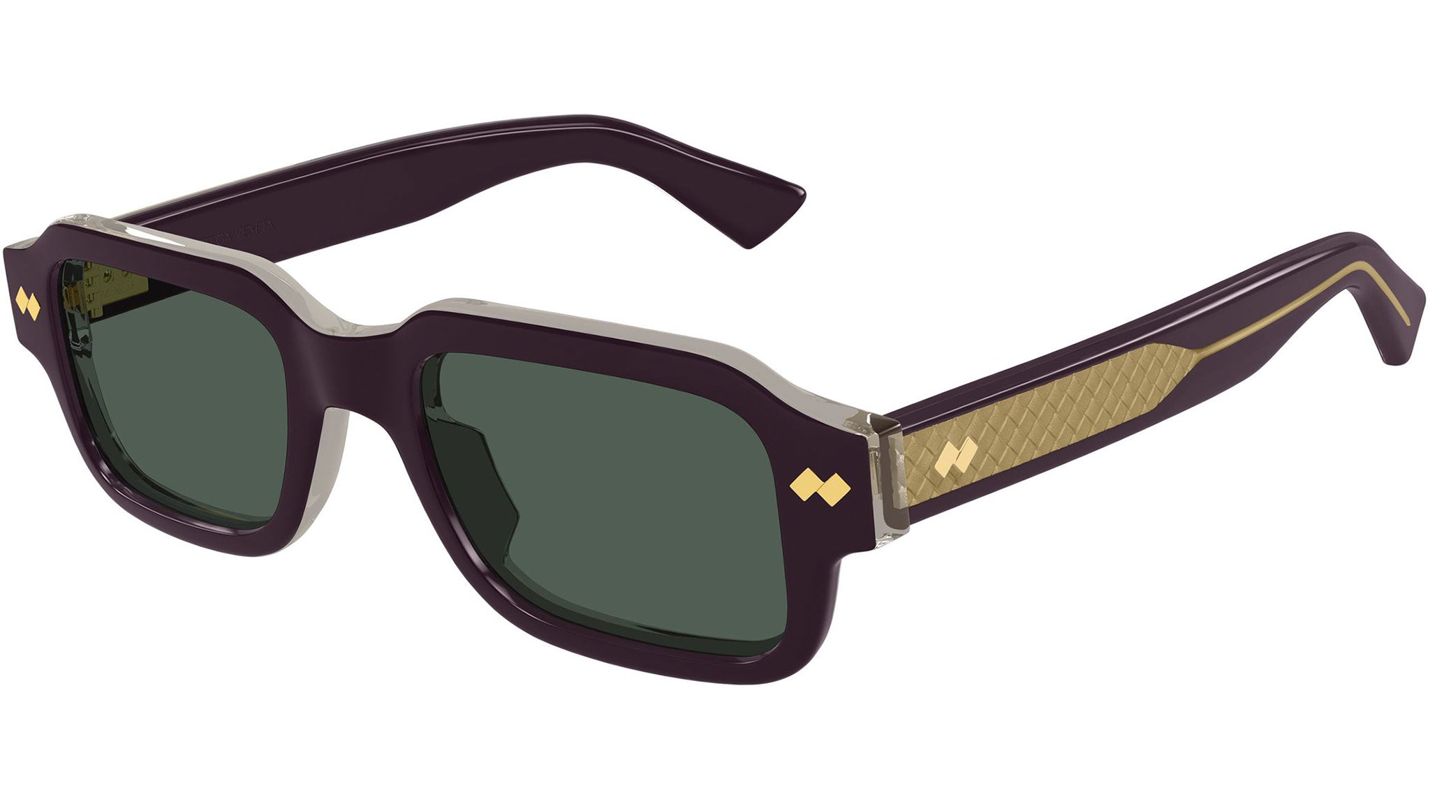 Occhiali da sole Bottega Veneta BV1442S 004 uomo con montatura rettangolare in acetato riciclato viola solido bilayer grigio trasparente e lenti verde tinta unita. Linea: Intrecciato. Codice modello: BV1442S. Codice colore: 004. Made in Japan. Rivenditore autorizzato Bottega Veneta online. Gli occhiali vengono consegnati con custodia e accessori originali e sono coperti dalla garanzia ufficiale di 12 mesi del produttore.