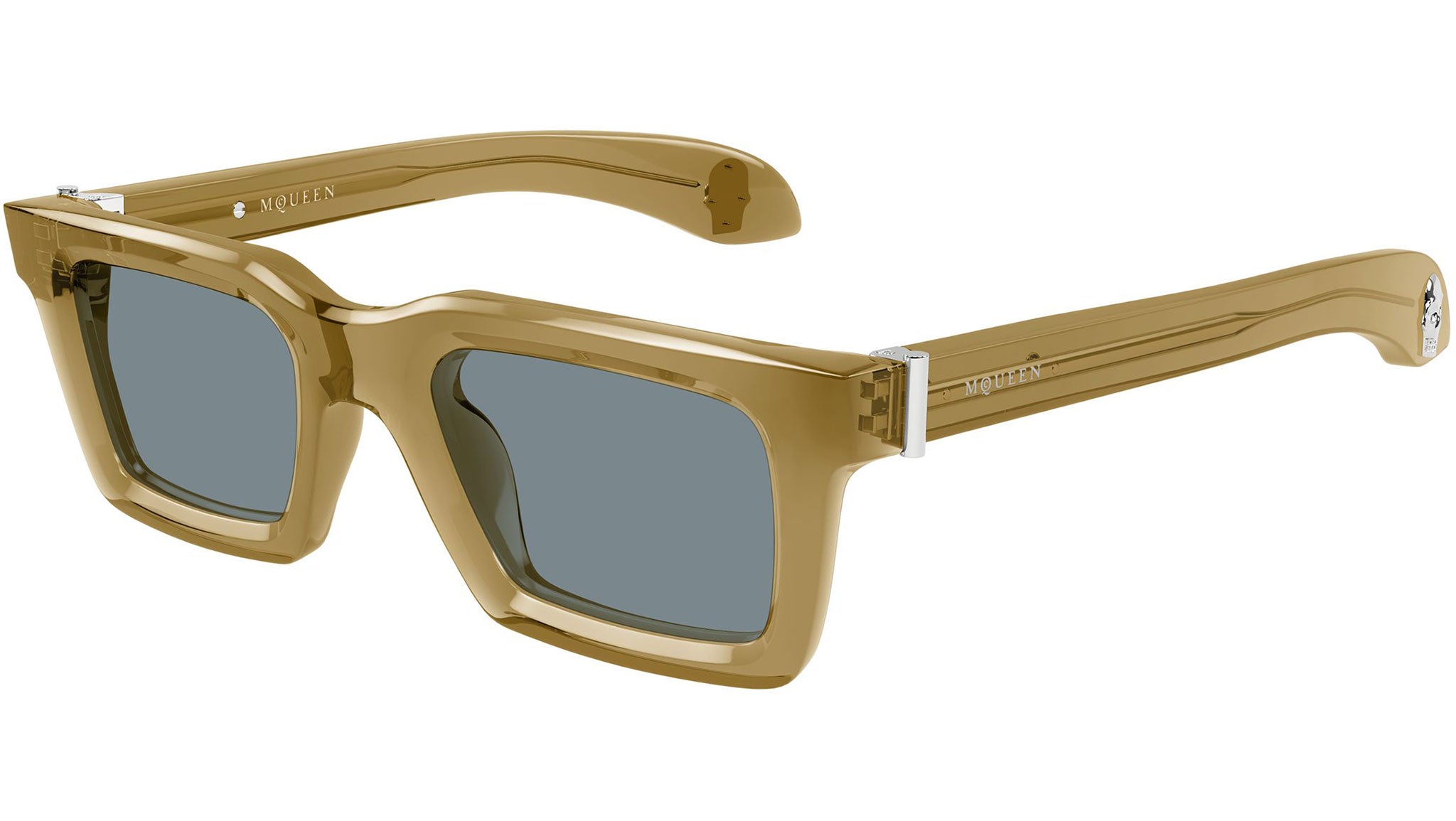 Occhiali da sole Alexander McQueen AM0506S 007 uomo con montatura rettangolare in acetato riciclato miele marrone trasparente lucido e lenti grigio chiaro tinta unita. Linea: Skull. Codice modello: AM0506S. Codice colore: 007. Made in Japan. Rivenditore autorizzato Alexander McQueen online. Gli occhiali vengono consegnati con custodia e accessori originali e sono coperti dalla garanzia ufficiale di 12 mesi del produttore.