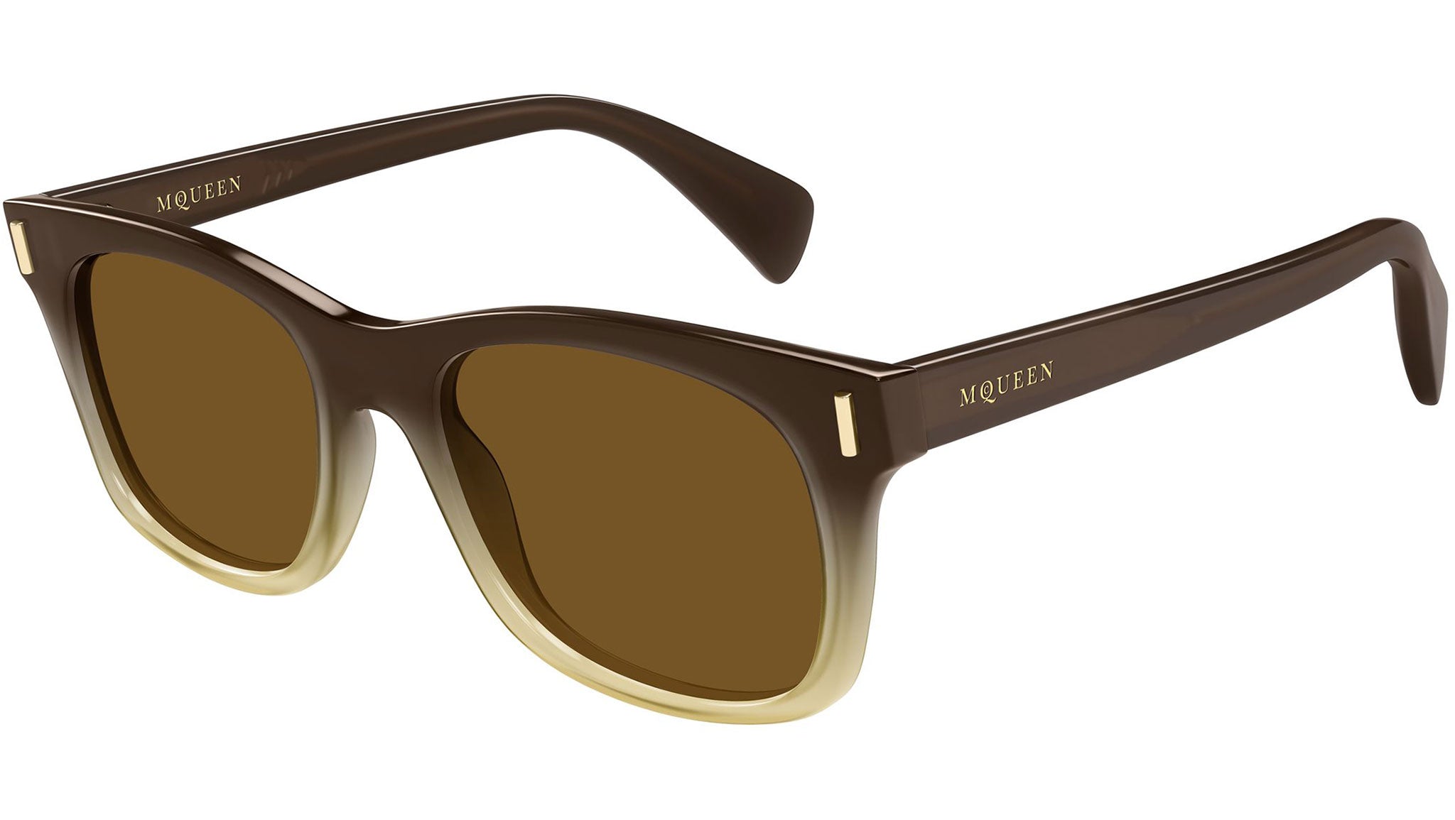 Occhiali da sole Alexander McQueen AM0551S 004 uomo con montatura rettangolare in acetato riciclato marrone opalino sfumato a miele opalino lucido e lenti marrone tinta unita. Linea: T-Bar. Codice modello: AM0551S. Codice colore: 004. Made in Italy. Rivenditore autorizzato Alexander McQueen online. Gli occhiali vengono consegnati con custodia e accessori originali e sono coperti dalla garanzia ufficiale di 12 mesi del produttore.