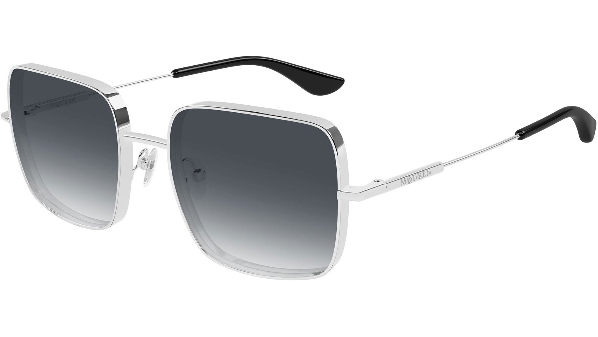Occhiali da sole Alexander McQueen AM0564S 001 donna con montatura rettangolare in metallo argento lucido e lenti grigio fumo sfumato. Linea: T-Bar. Codice modello: AM0564S. Codice colore: 001. Made in Italy. Rivenditore autorizzato Alexander McQueen online. Gli occhiali vengono consegnati con custodia e accessori originali e sono coperti dalla garanzia ufficiale di 12 mesi del produttore.