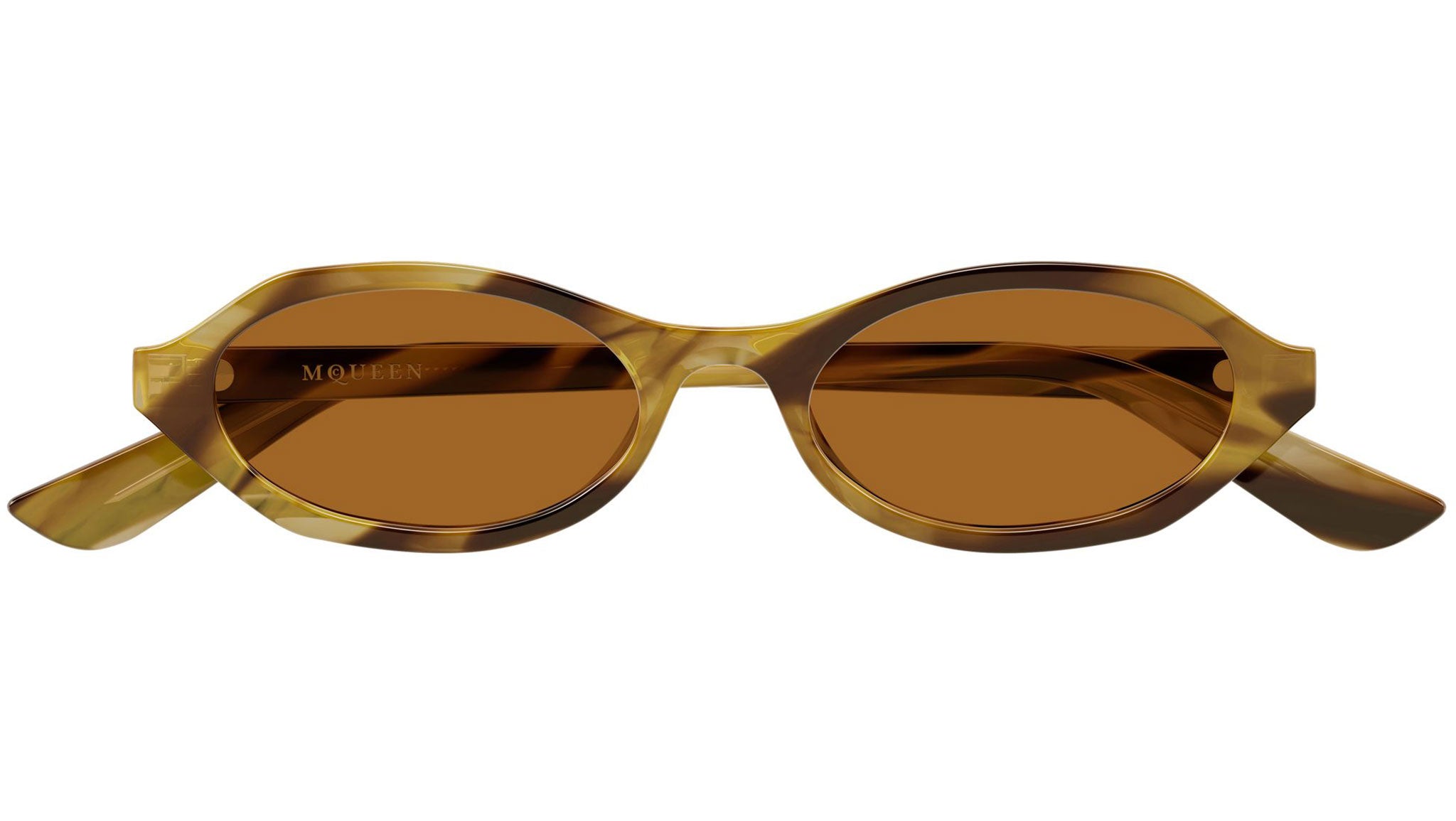 Occhiali da sole Alexander McQueen AM0559S 003 donna con montatura pantos in acetato riciclato avana giallo rigato lucido e lenti marrone ruggine. Linea: Logo. Codice modello: AM0559S. Codice colore: 003. Made in Italy. Rivenditore autorizzato Alexander McQueen online. Gli occhiali vengono consegnati con custodia e accessori originali e sono coperti dalla garanzia ufficiale di 12 mesi del produttore.