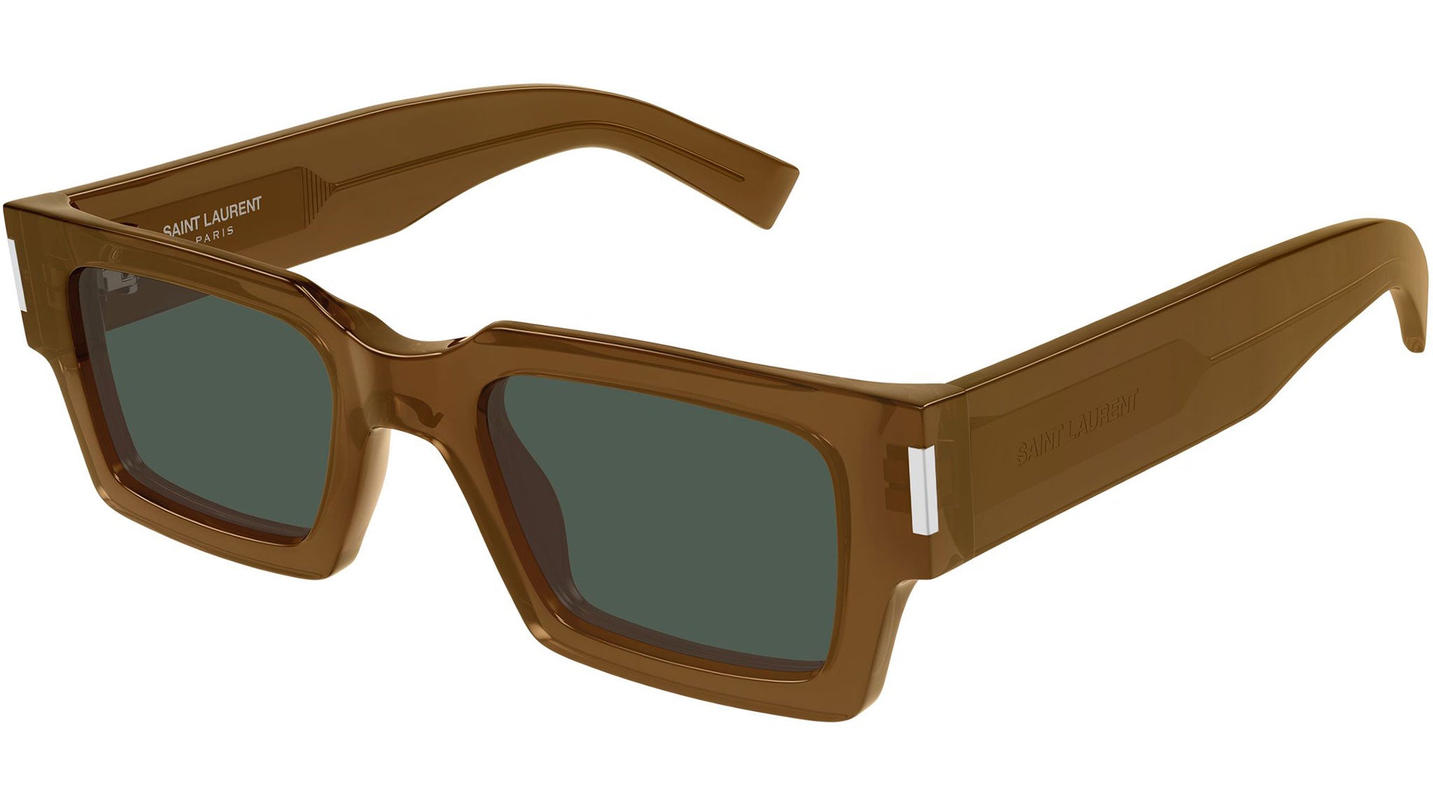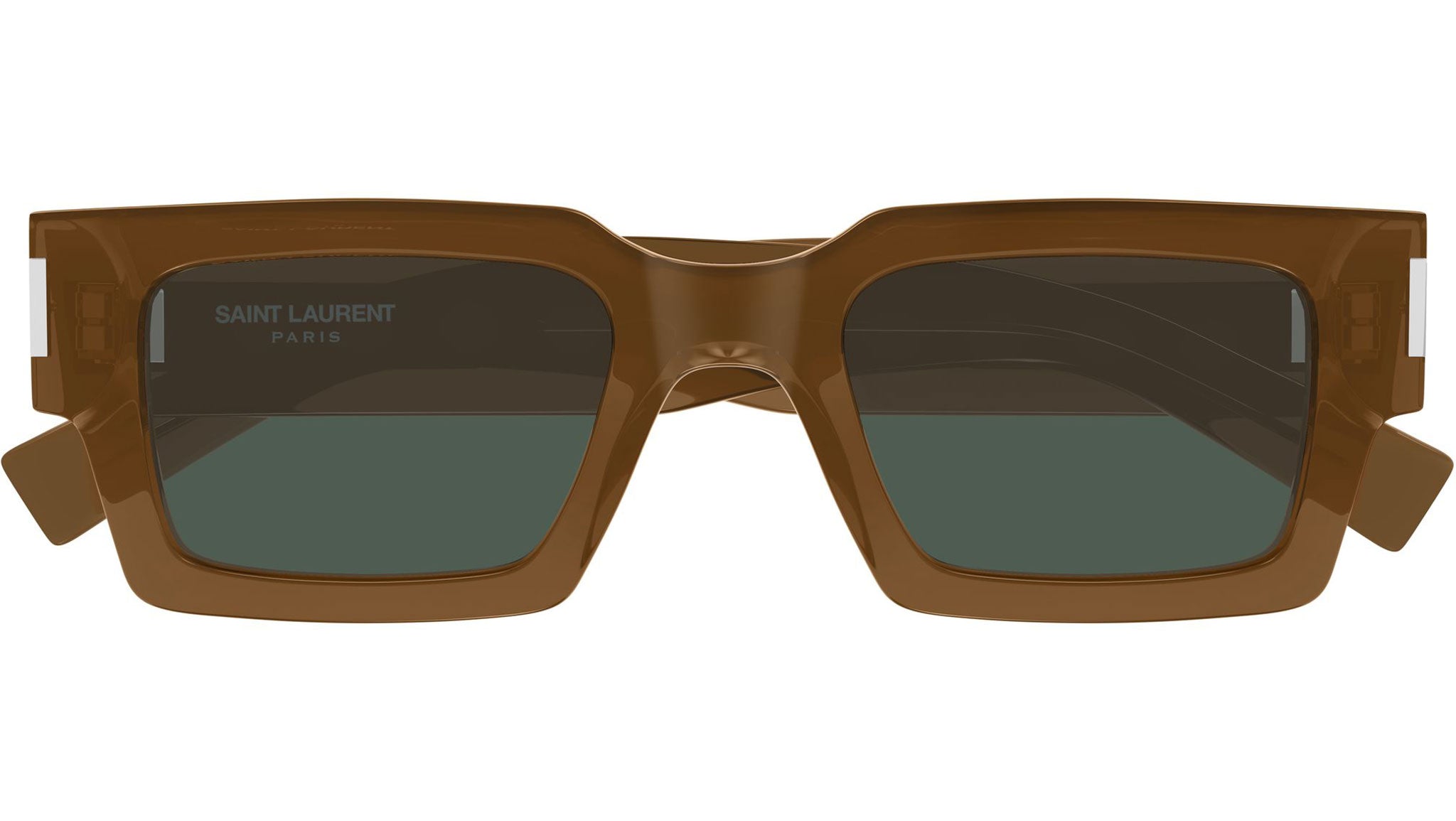 Occhiali da sole Saint Laurent SL 572 011 unisex con montatura rettangolare in acetato riciclato marrone cognac trasparente e lenti verde tinta unita. Linea: Corner Angle. Codice modello: SL 572. Codice colore: 011. Made in Japan. Rivenditore autorizzato Saint Laurent online. Gli occhiali vengono consegnati con custodia e accessori originali e sono coperti dalla garanzia ufficiale di 12 mesi del produttore.