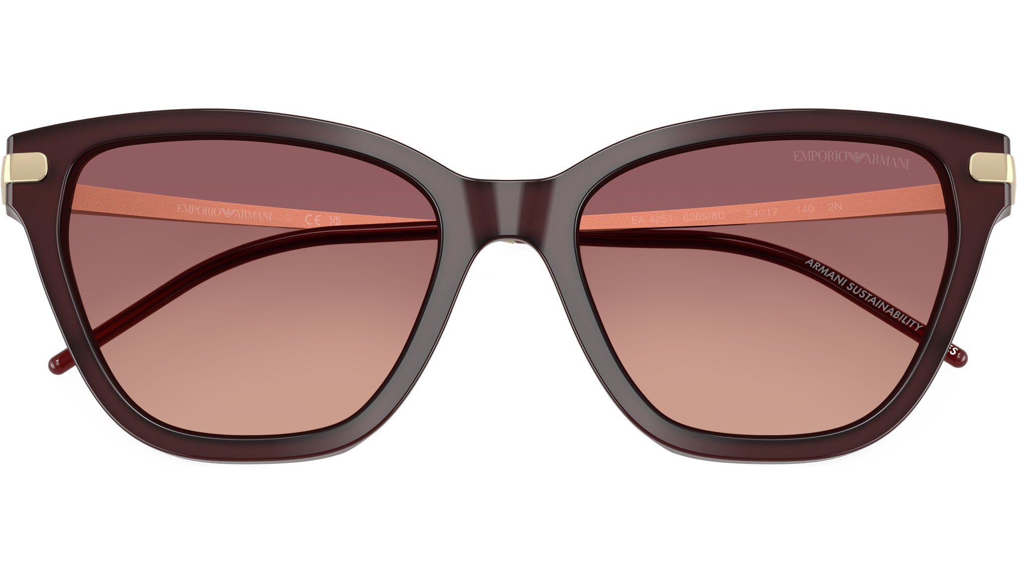 Occhiali da sole Emporio Armani EA4251 62658D con montatura cat eye in acetato opale lucido bordeaux e lenti in bio poliammide color rosa sfumato viola. Vestibilità a ponte alto. Linea: Modern. Codice modello: 0EA4251. Codice colore: 62658D. Rivenditore autorizzato Emporio Armani online. Gli occhiali vengono consegnati con custodia e accessori originali e sono coperti dalla garanzia ufficiale di 12 mesi del produttore.