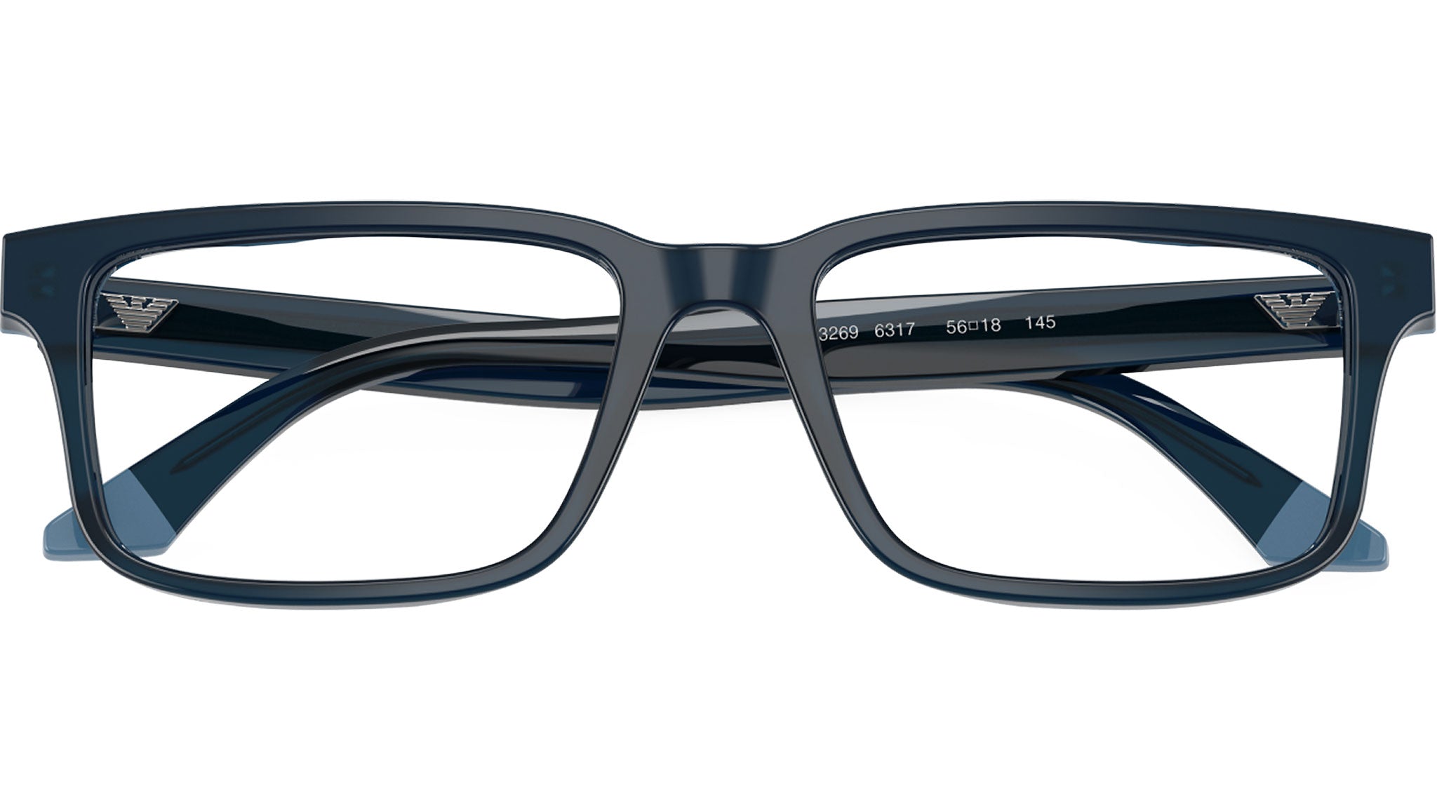 Occhiali da vista Emporio Armani EA3269 6317 con montatura rettangolare in acetato blu opalino e lenti demo. Vestibilità a ponte alto. Linea: Essential Leisure. Codice modello: 0EA3269. Codice colore: 6317. Rivenditore autorizzato Emporio Armani online. Gli occhiali vengono consegnati con custodia e accessori originali e sono coperti dalla garanzia ufficiale di 12 mesi del produttore.