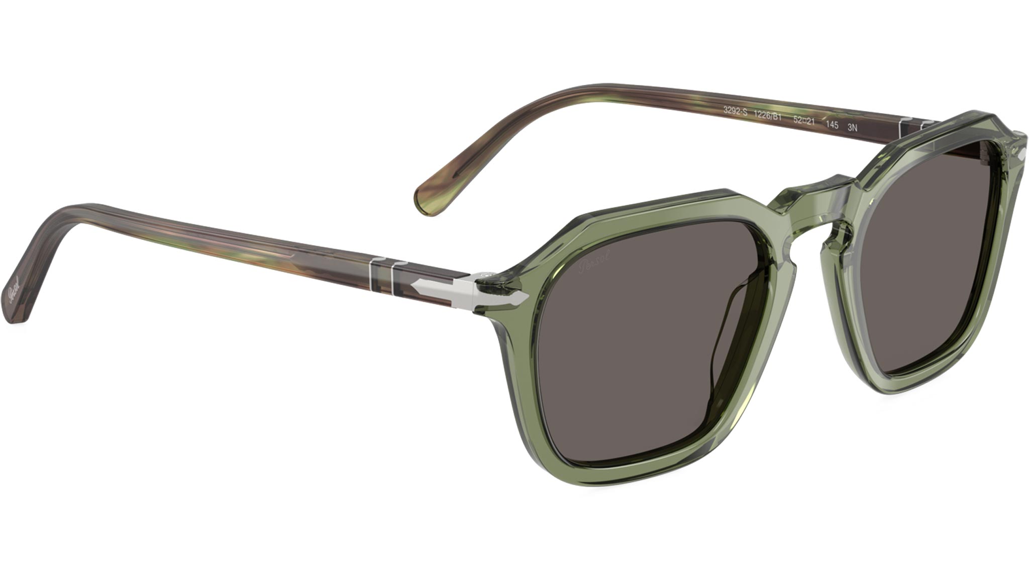 Occhiali da sole Persol unisex modello PO3292S 1226B1 con montatura squadrata in acetato verde trasparente e lenti in cristallo grigio scuro base 6. Vestibilità a ponte alto. Linea: Icona. Codice Brand: 0PO3292S. Codice colore: 1226B1. Rivenditore autorizzato online Persol Eyewear. Ogni prodotto Persol viene consegnato con astuccio originale e accessori ed è coperto da garanzia del produttore di 12 mesi.