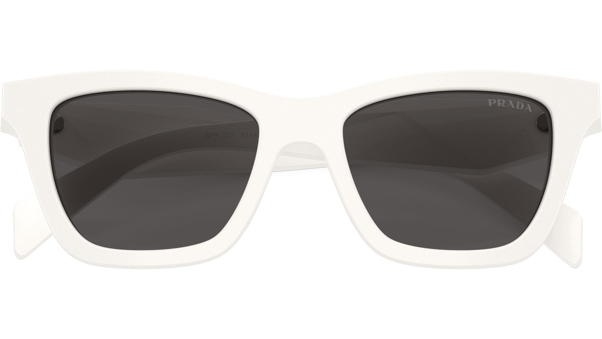 Occhiali da sole Prada PR C07S 17K08Z donna con montatura butterfly in acetato talco e lenti in bio poliammide color grigio scuro. Vestibilità a ponte alto. Linea: Design. Codice modello: PRC07S. Codice colore: 17K08Z. Made in Italy. Rivenditore autorizzato Prada online. Gli occhiali vengono consegnati con custodia e accessori originali e sono coperti dalla garanzia ufficiale di 12 mesi del produttore.