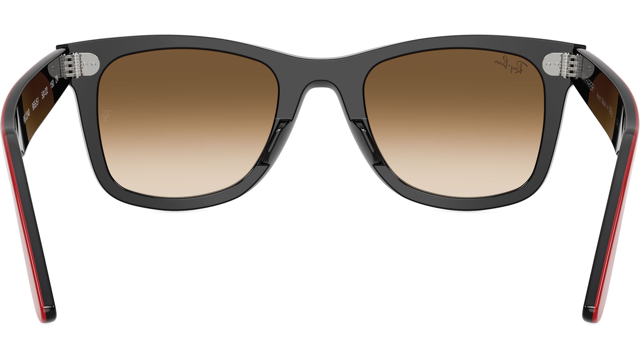 Occhiali da sole Ray-Ban Wayfarer RB2240 955/51 unisex con montatura squadrata in acetato rosso su nero e lenti in cristallo color marrone chiaro sfumato. Vestibilità a ponte alto. Linea: Evolution. Codice modello: 0RB2240. Codice colore: 955/51. Rivenditore autorizzato Ray-Ban online. Gli occhiali vengono consegnati con custodia e accessori originali e sono coperti dalla garanzia ufficiale di 12 mesi del produttore.