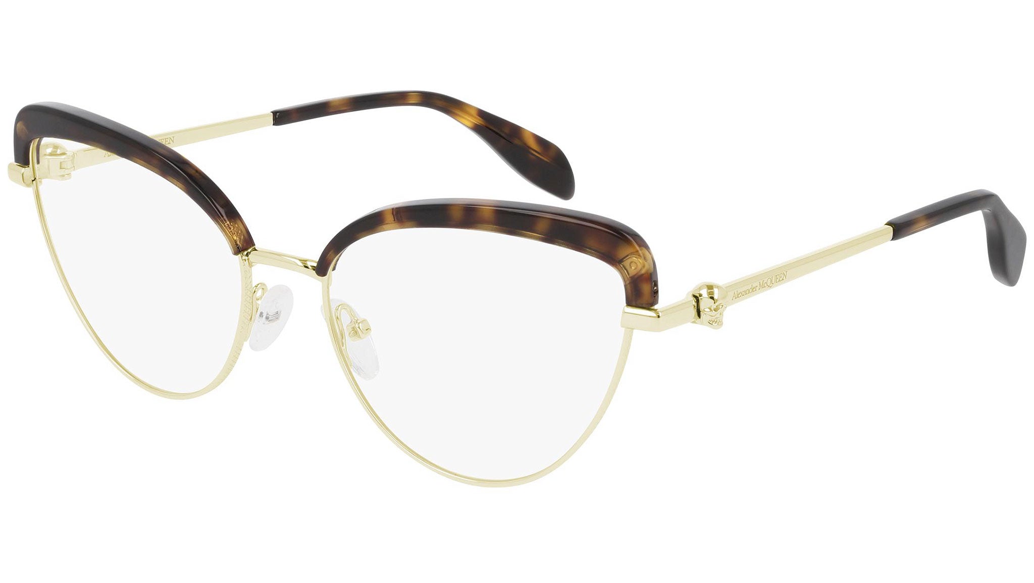 Alexander McQueen optical glasses model AM0259O 002 featuring shiny light gold / shiny dark havana frame. Synonymous with fearless fashion, Alexander McQueen Eyewear eyewear styles represent a juxtaposition between contrasting elements, as his runway styles are unique and inspiring. Buy your frames online and take them to your local optician to fit prescription lenses.