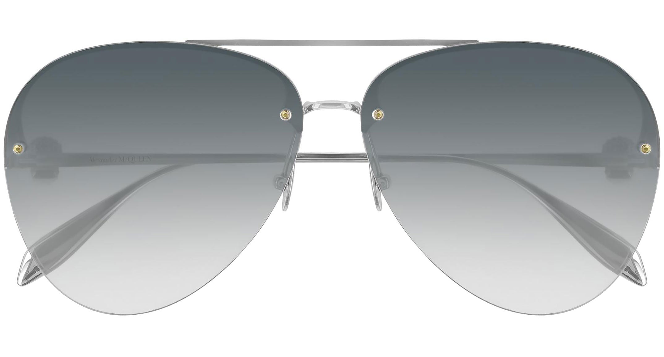 Alexander McQueen Couture sunglasses collection model AM0270S 001 featuring shiny antique silver (copy of master reference "0446" by amom) frame and gradient grey lens. Alexander McQueen eyewear styles represent a juxtaposition between contrasting elements: femininity and masculinity, fragility and strength, tradition and modernity. An innovative and uncompromising identity of the fashion house.