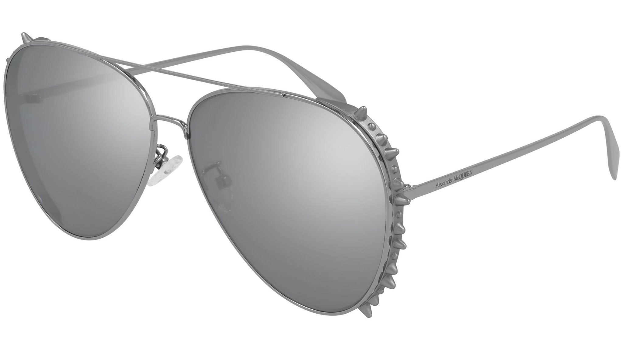 Occhiali da sole Alexander McQueen linea Rebellion modello AM0308S 003, variante colore rutenio chiaro lucido con lenti color argento + grigio tinta unita. Sinonimo di fashion irriverente e senza inibizioni, i modelli Alexander McQueen Eyewear rappresentano la pura giustapposizione tra elementi contrastanti, declinata in modelli da passerella dal segno unico, stimolante e moderno.