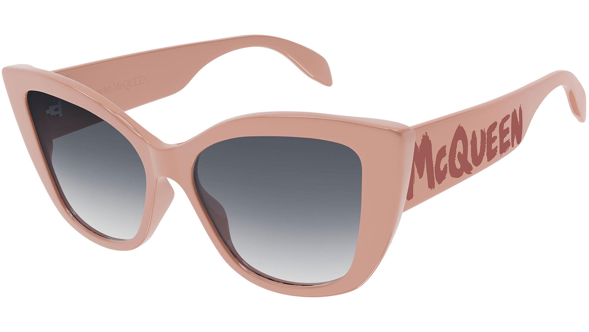 Occhiali da sole Alexander McQueen linea Casual Lines modello 0347S, variante colore 003 rosa tinta unita lucido con lenti color grigio sfumato.