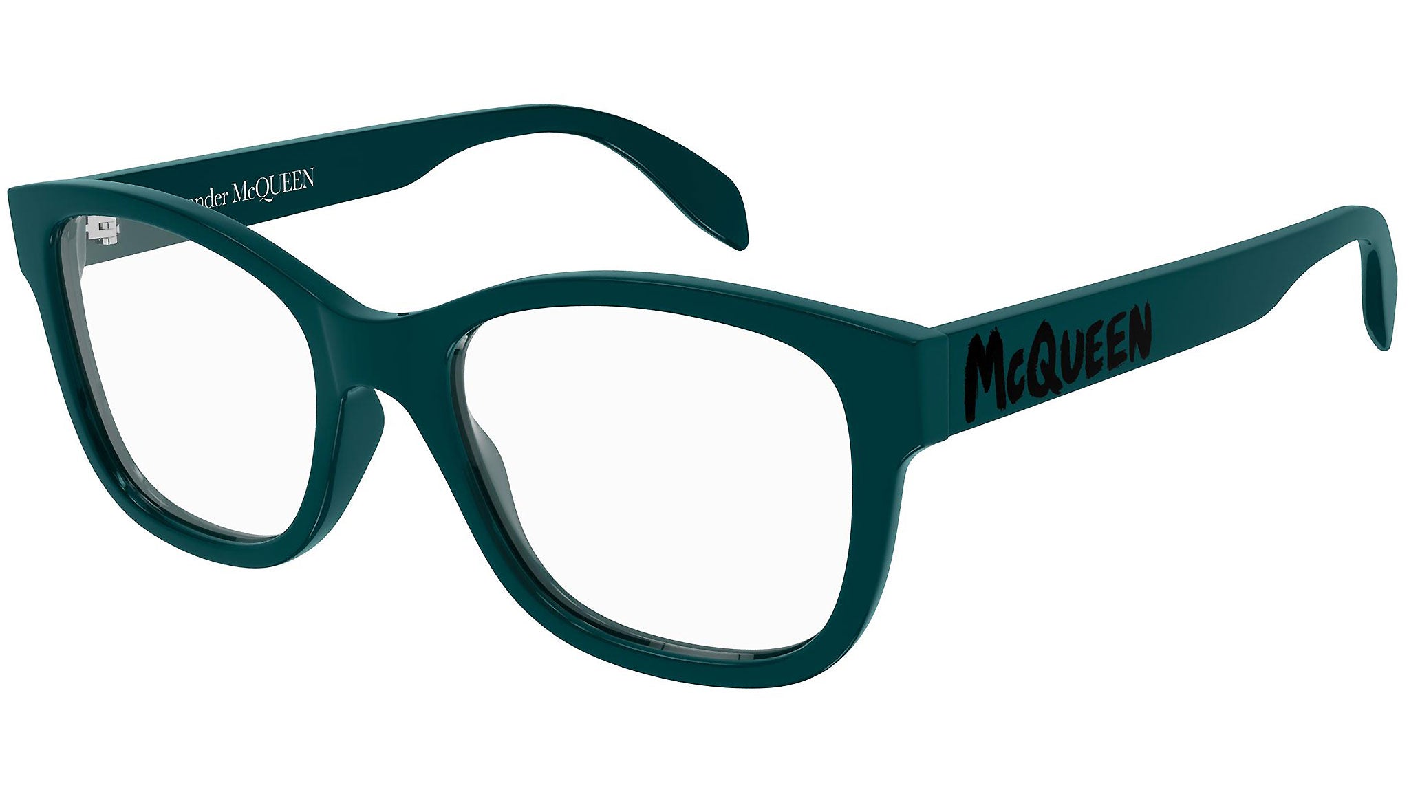 Occhiali da vista Alexander McQueen linea Casual Lines modello 0350O, variante colore 003 verde scuro tinta unita lucido con astine color verde.