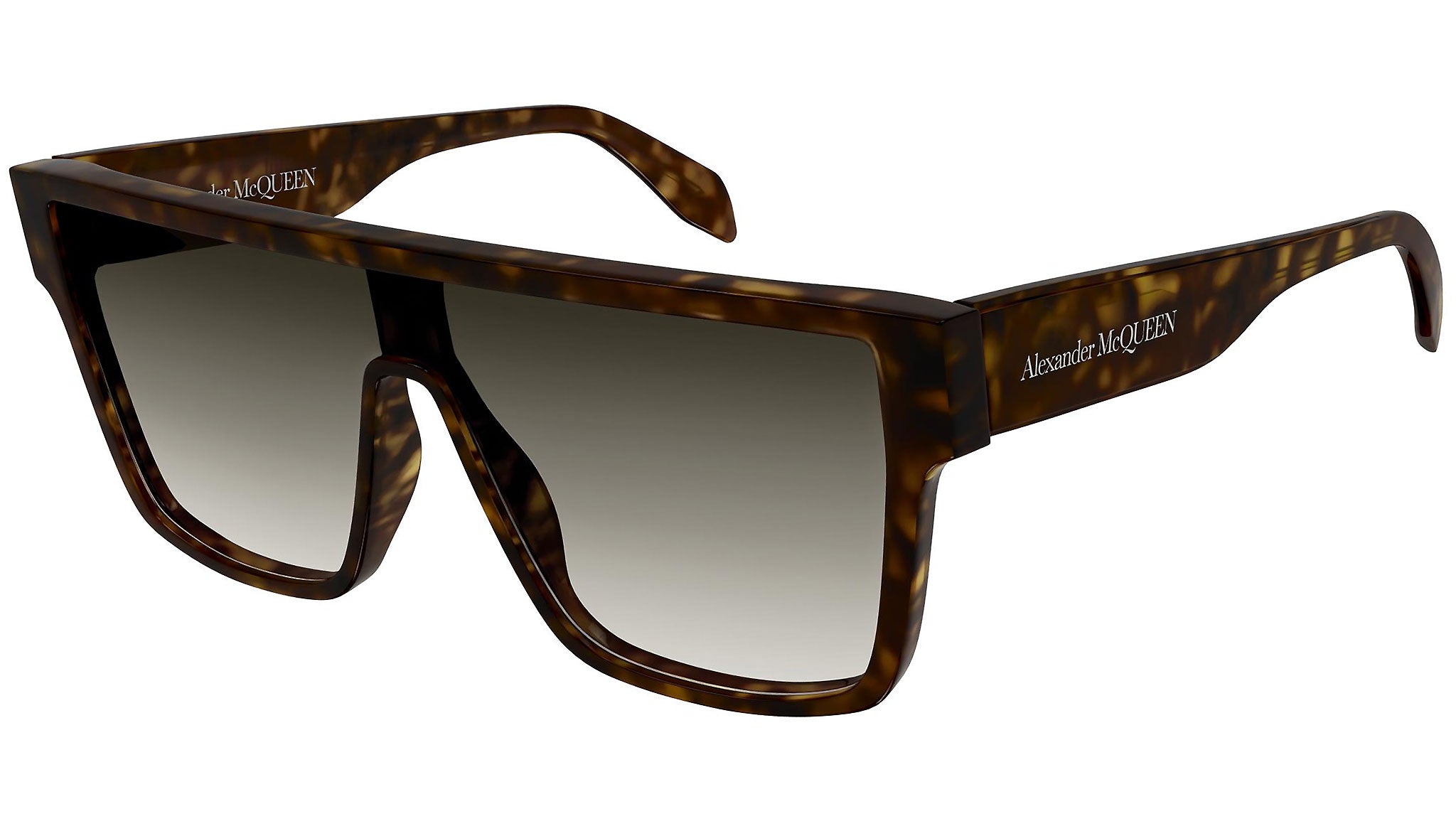Occhiali da sole Alexander McQueen linea Casual Lines modello 0354S, variante colore 002 tartaruga scuro lucido con lenti color marrone medio sfumato.