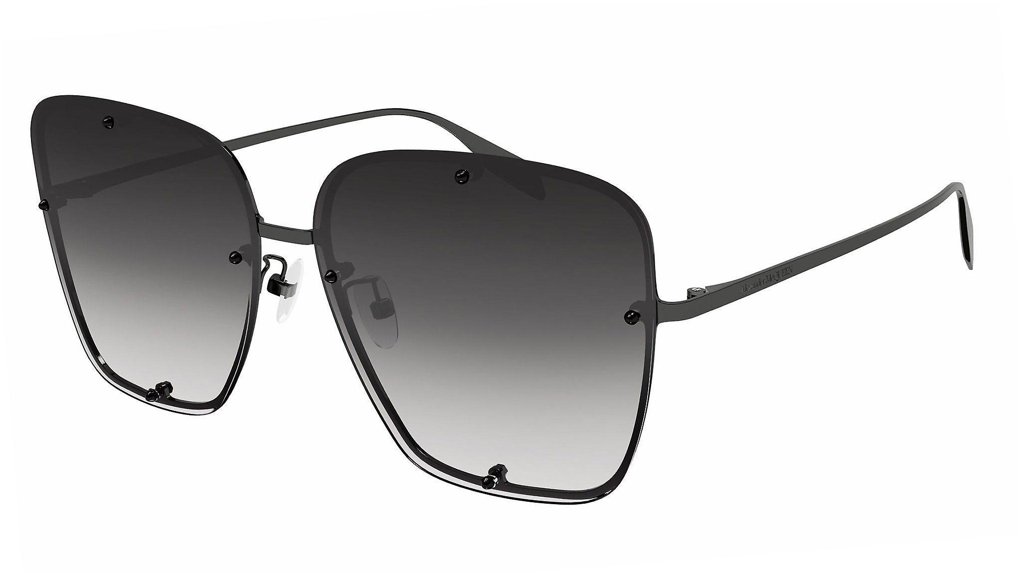Occhiali da sole Alexander McQueen linea Icons modello 0364S, variante colore 001 rutenio scuro lucido con lenti color grigio sfumato.