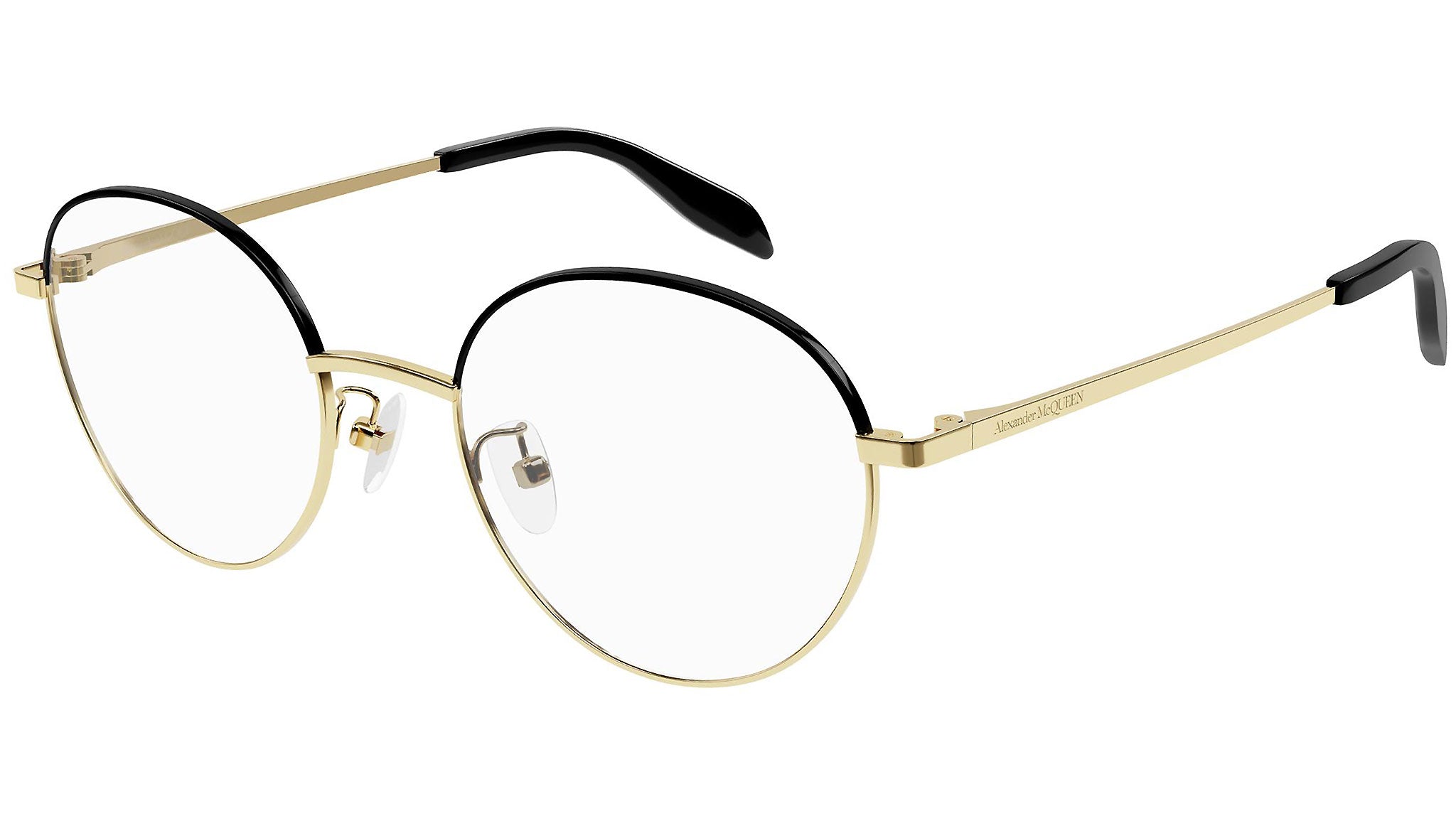 Occhiali da vista Alexander McQueen linea Icons modello 0369O, variante colore 001 oro chiaro lucido e nero vernice lucido con astine color oro.