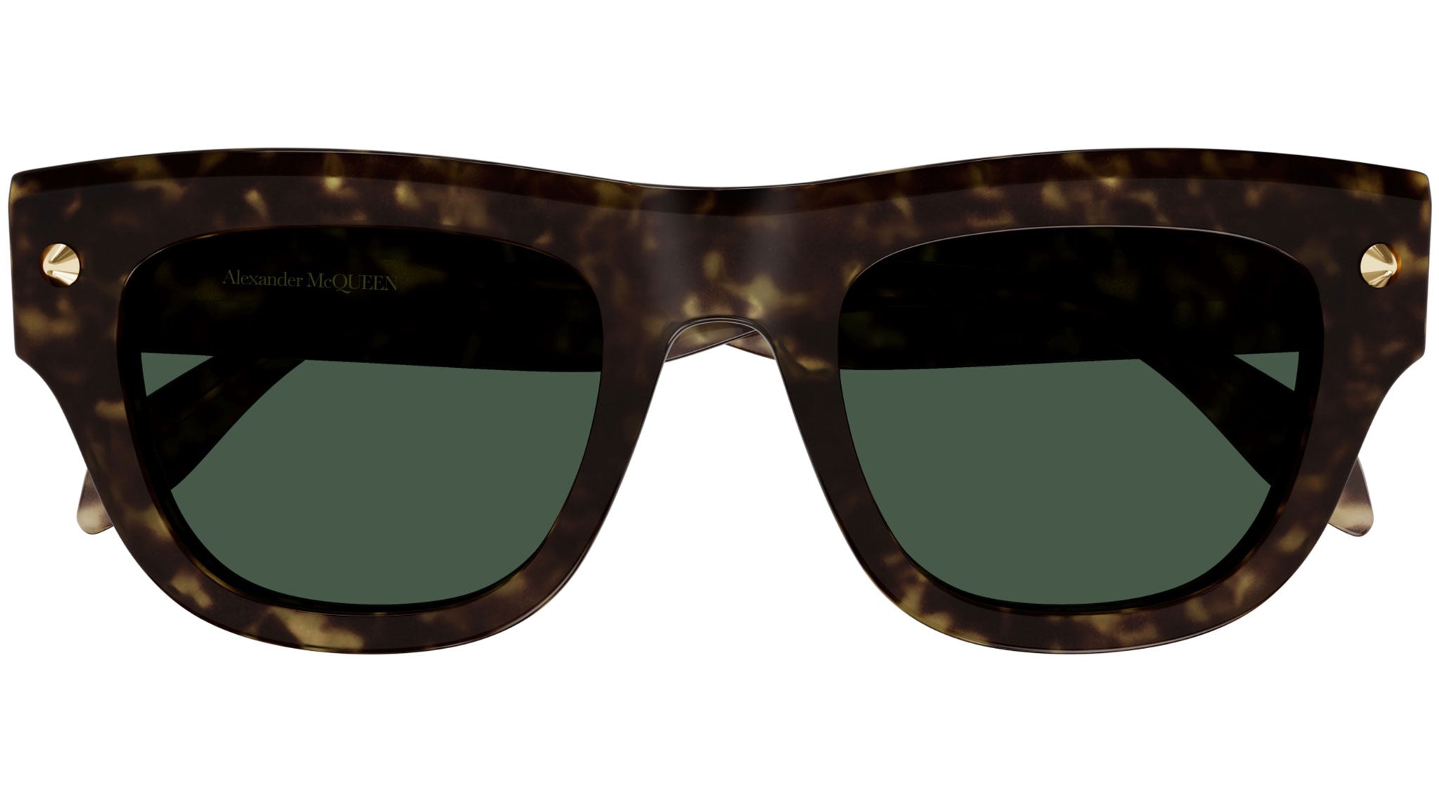 Occhiali da sole Alexander McQueen Icons modello AM0425S rectangle in acetato riciclato codice colore 002 avana scuro lucido con borchie oro con aste tartaruga e lenti color verde tinta unita.
