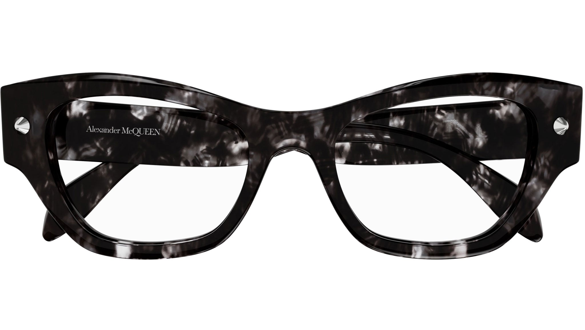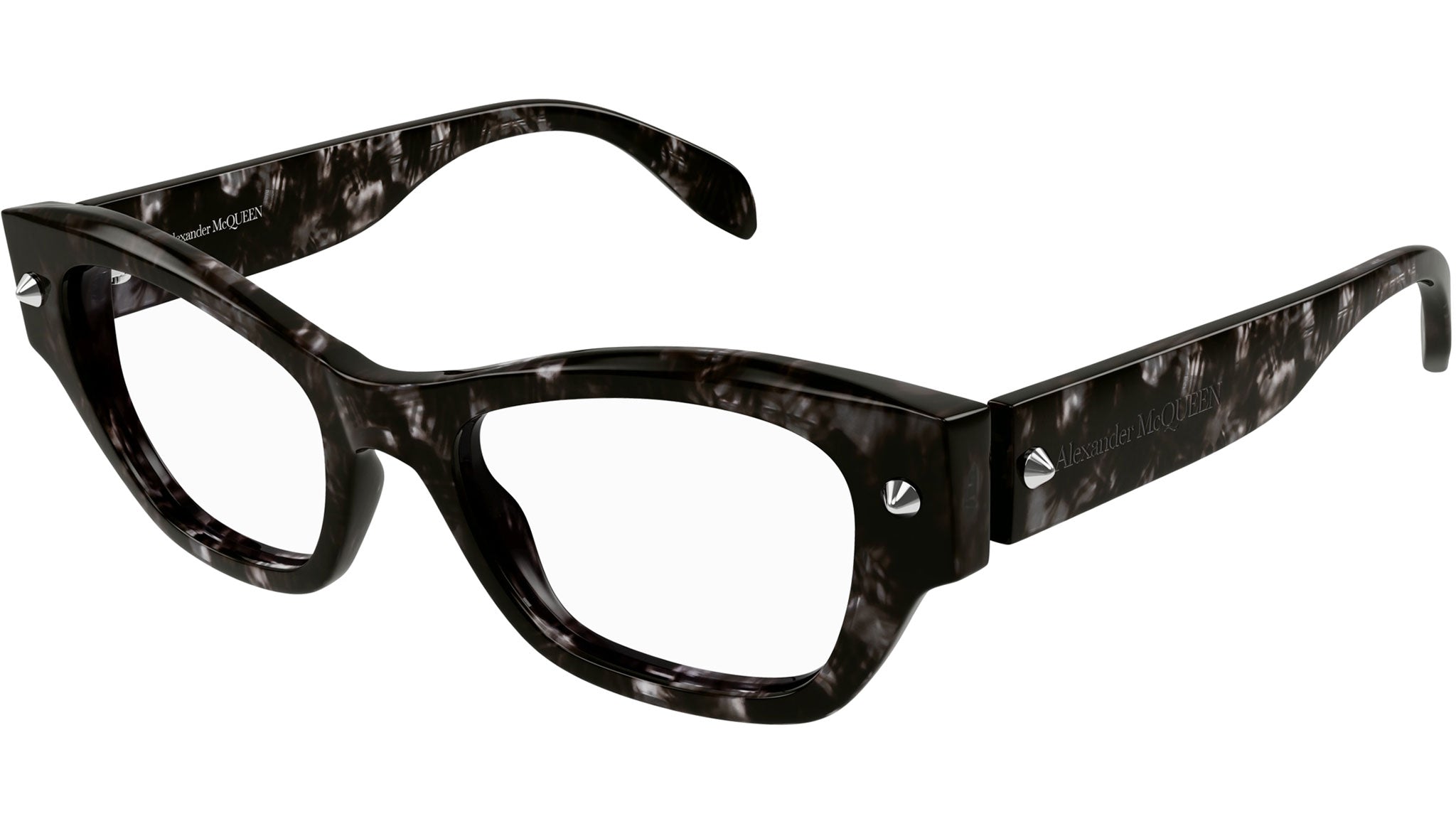 Occhiali da vista Alexander McQueen Icons modello AM0429O cat eye in acetato riciclato codice colore 003 avana grigio lucido con borchie in argento con aste tartaruga e lenti demo.