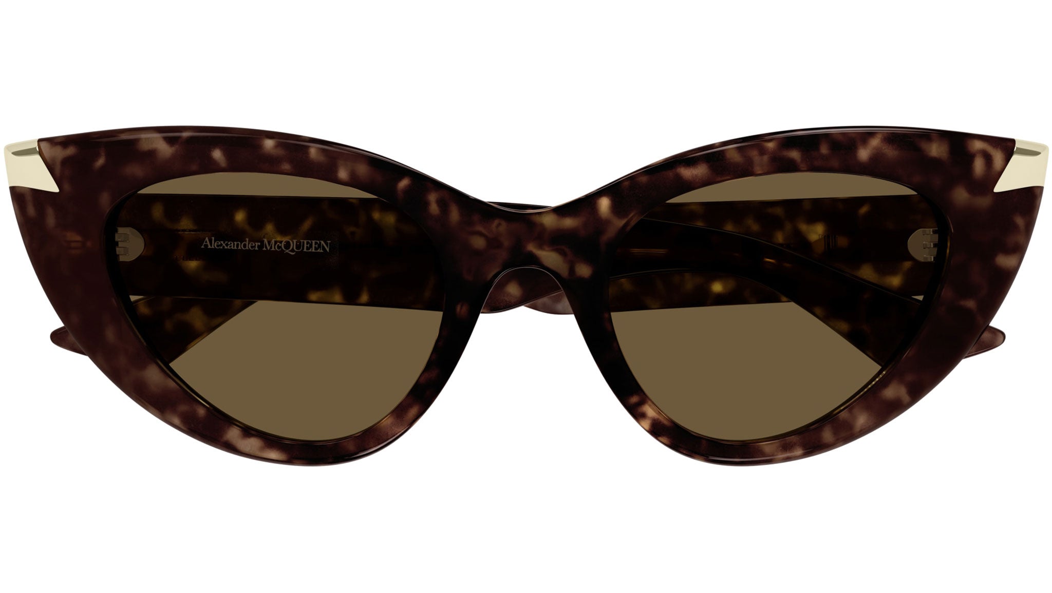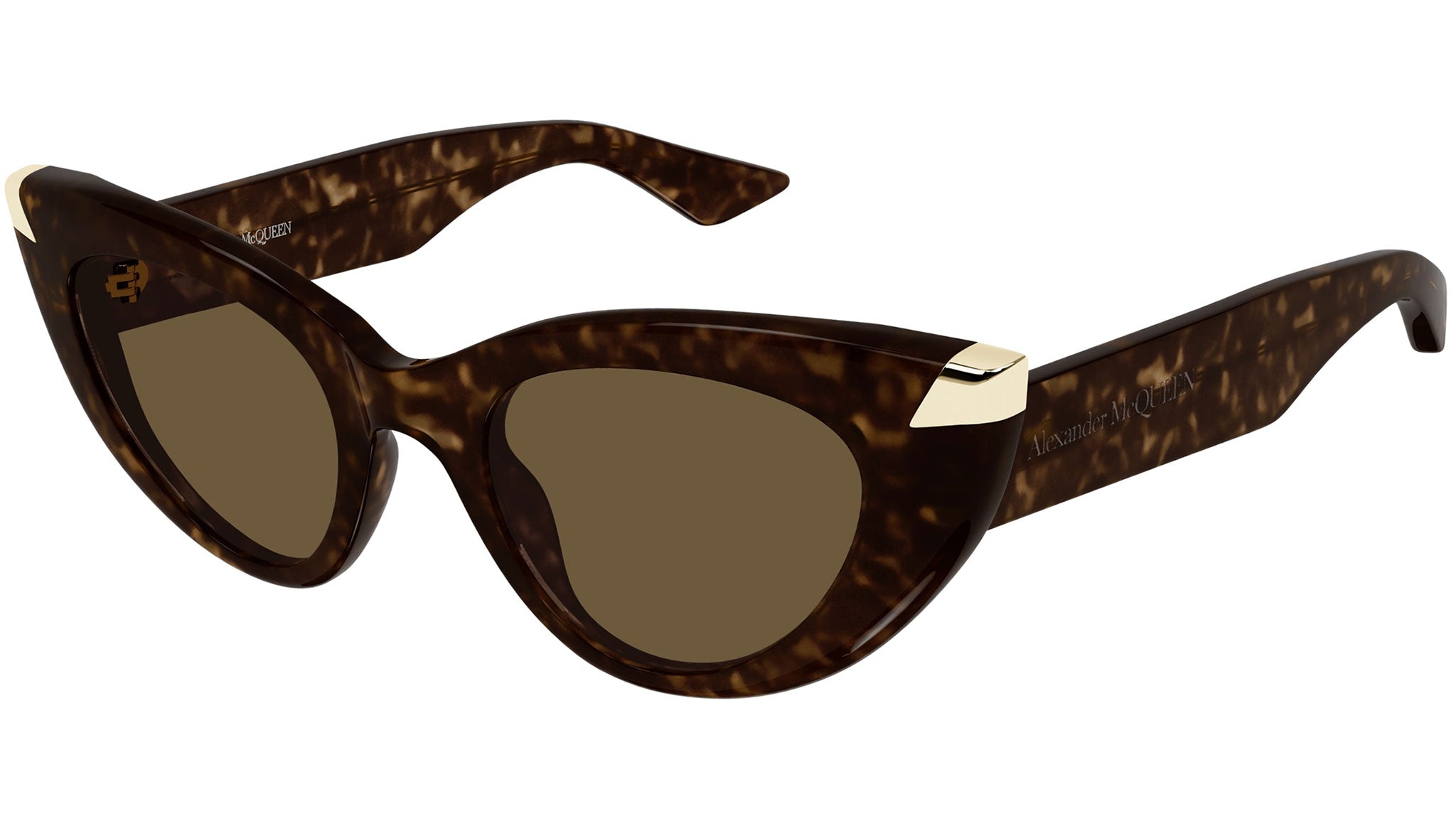 Occhiali da sole Alexander McQueen Icons modello AM0442S cat eye in acetato riciclato codice colore 003 tartaruga scuro lucido con aste tartaruga e lenti color beige nicotine tinta unita.