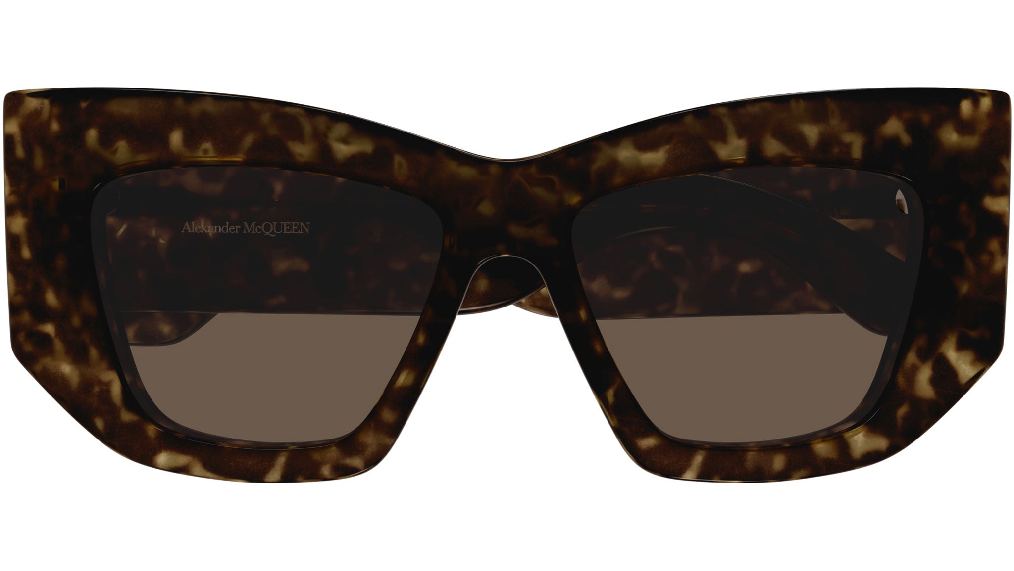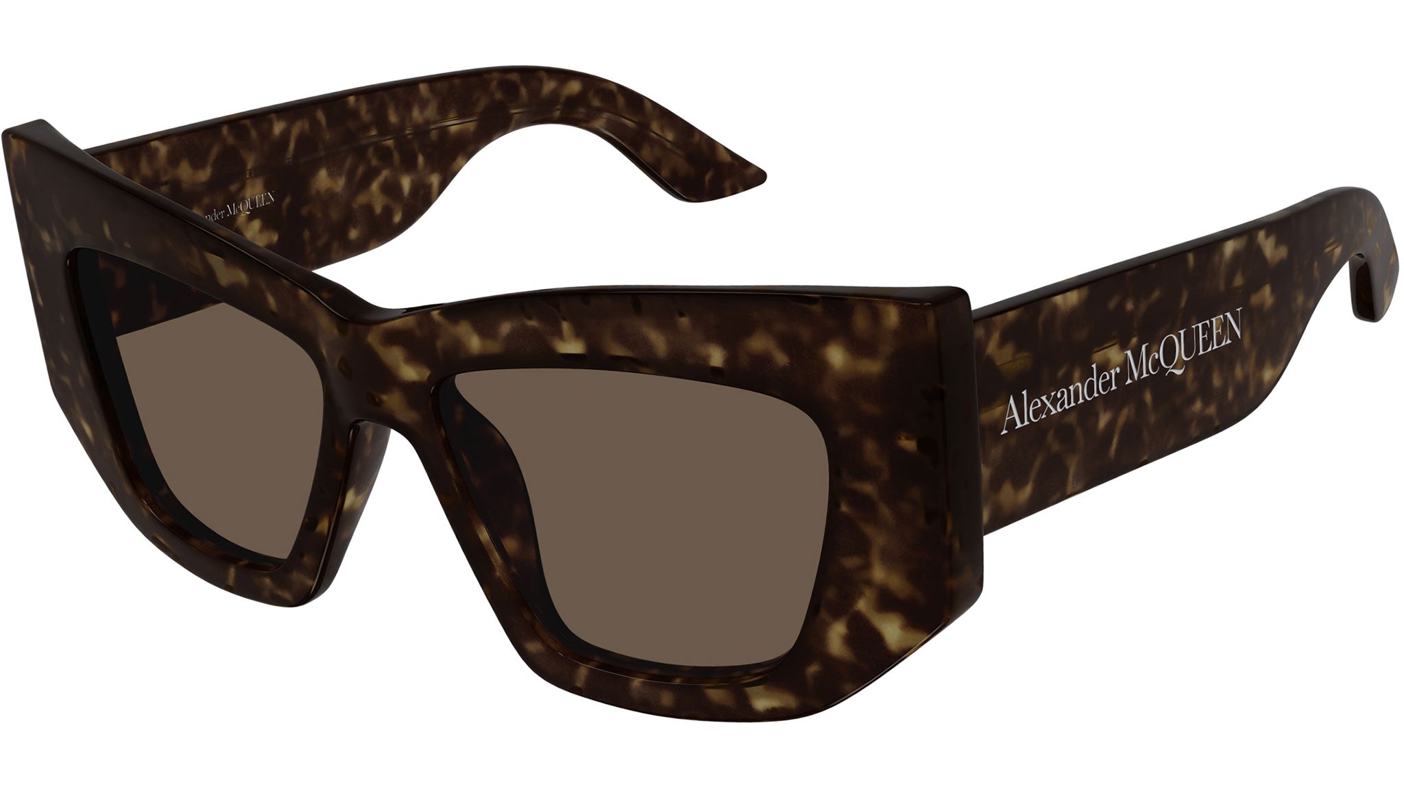 Occhiali da sole Alexander McQueen Casual Lines modello AM0448S cat eye in acetato riciclato codice colore 002 tartaruga scuro lucido con aste tartaruga e lenti color marrone tinta unita.