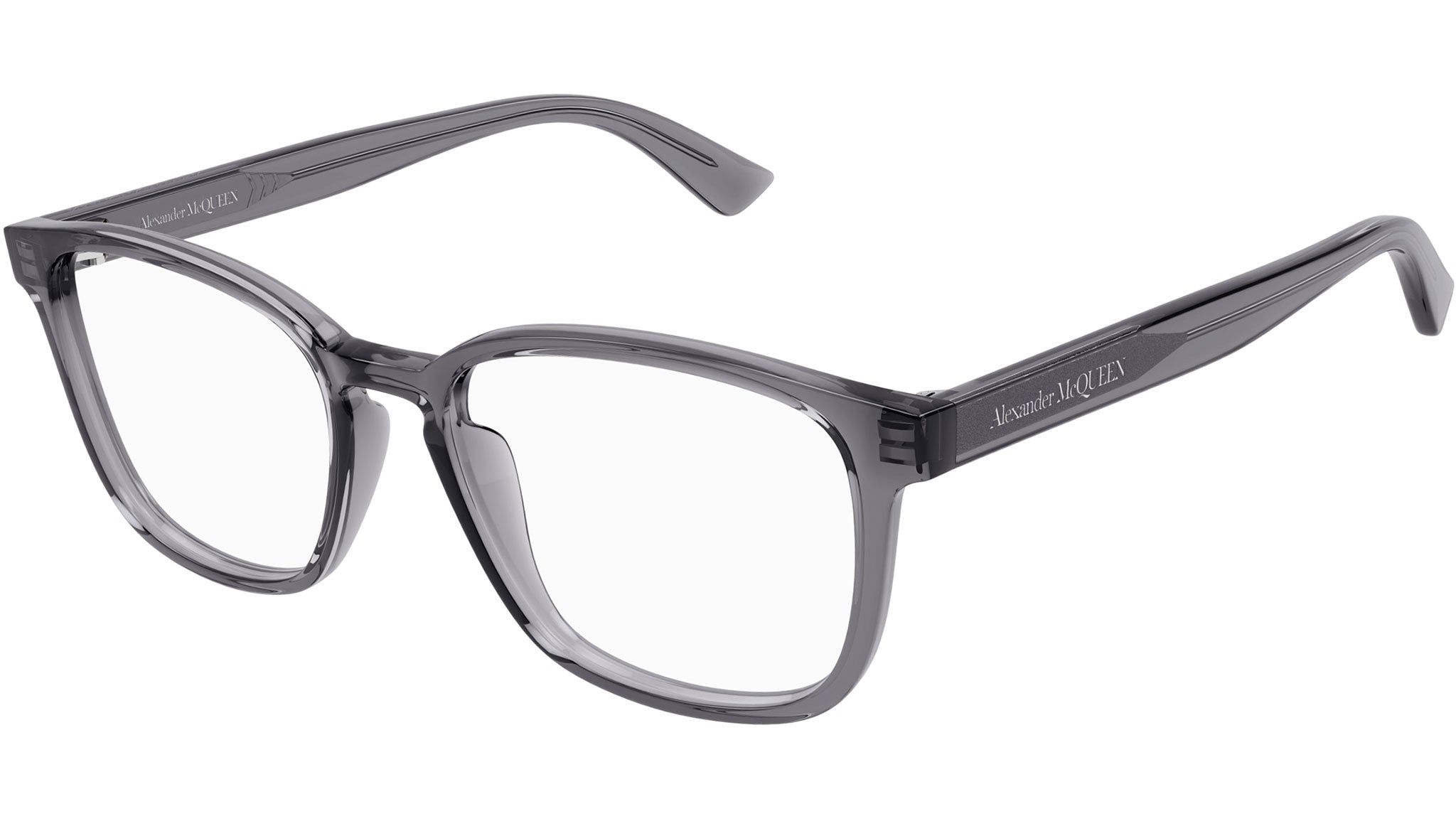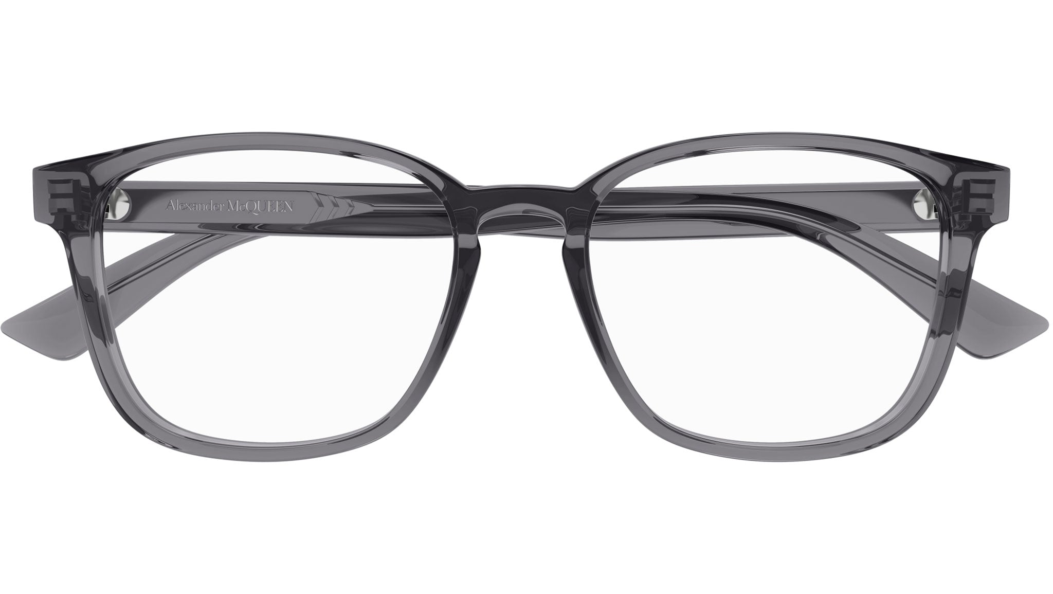 Occhiali da vista Alexander McQueen Casual Lines modello AM0462O rectangle in acetato riciclato codice colore 003 grigio scuro trasparente lucido con aste grigio e lenti demo.