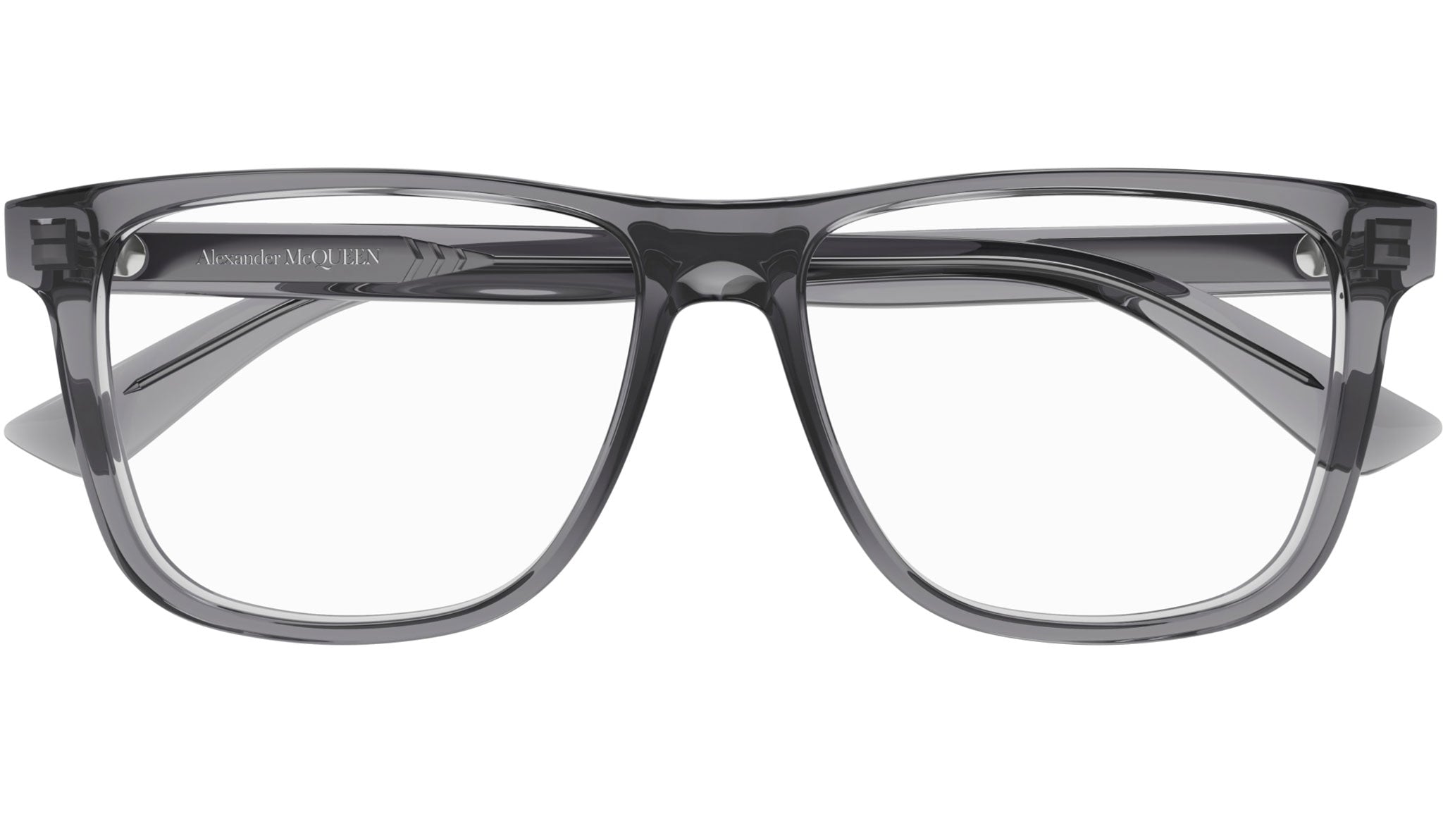 Occhiali da vista Alexander McQueen Casual Lines modello AM0463O aviator in acetato riciclato codice colore 003 grigio scuro trasparente lucido con aste grigio e lenti demo.