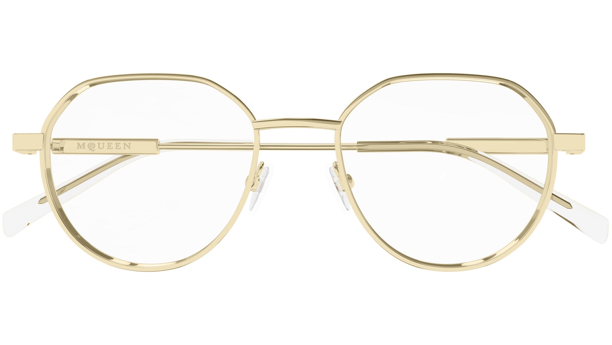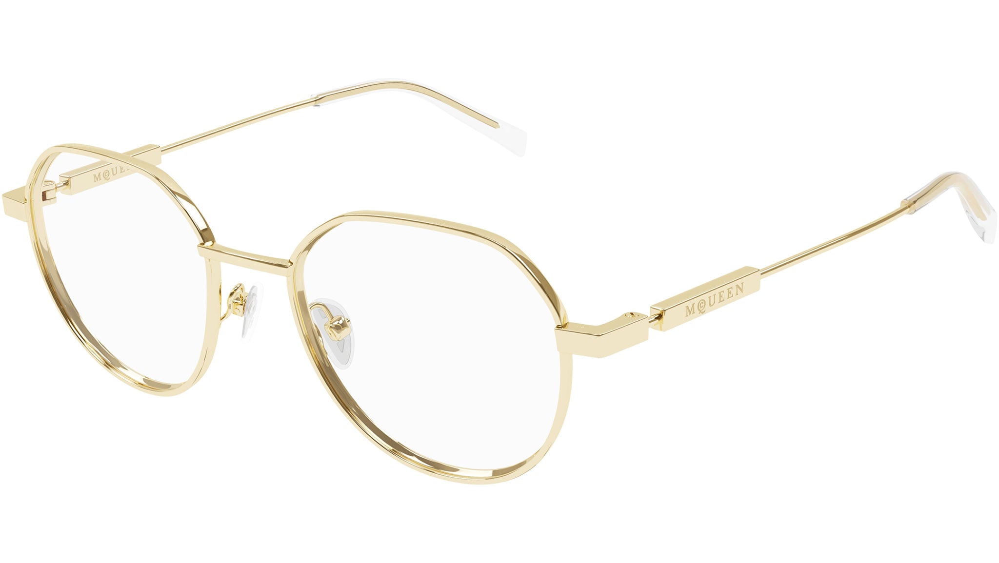 Occhiali da vista Alexander McQueen Casual Lines modello AM0479O in metallo panto codice colore 002 oro chiaro lucido con aste oro e lenti demo. Rivenditore autorizzato Alexander McQueen online. Gli occhiali vengono consegnati con custodia e accessori originali e sono coperti dalla garanzia ufficiale di 12 mesi del produttore.