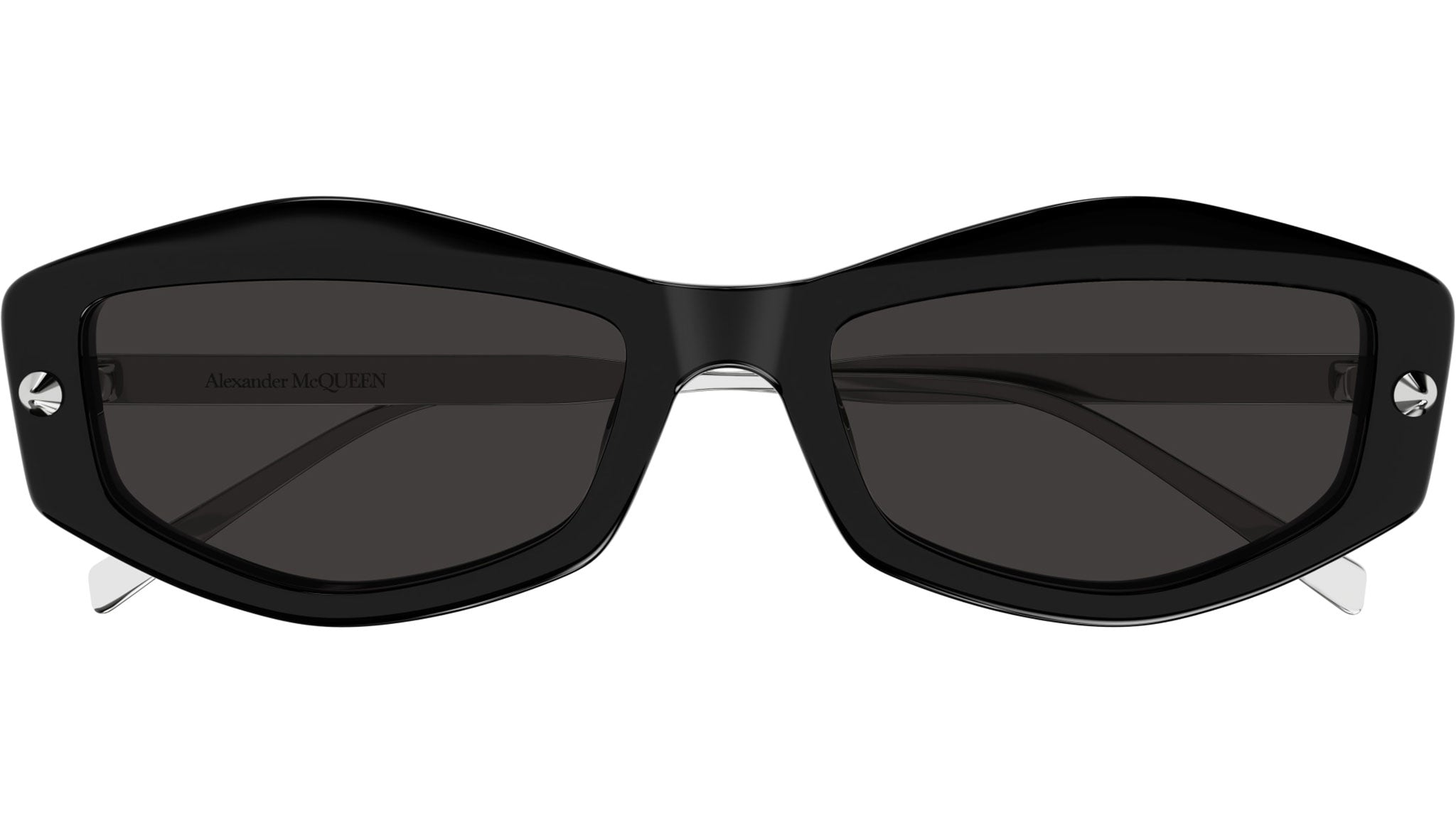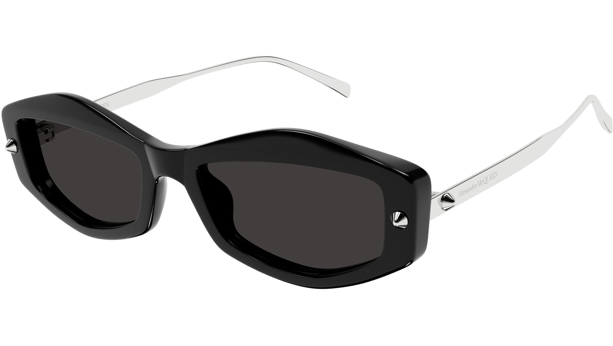 Occhiali da sole Alexander McQueen Icons modello AM0482S in acetato riciclato rettangolare, codice colore 001 nero lucido tinta unita con aste argento e lenti color grigio tinta unita. Rivenditore autorizzato Alexander McQueen online. Gli occhiali vengono consegnati con custodia e accessori originali e sono coperti dalla garanzia ufficiale di 12 mesi del produttore.