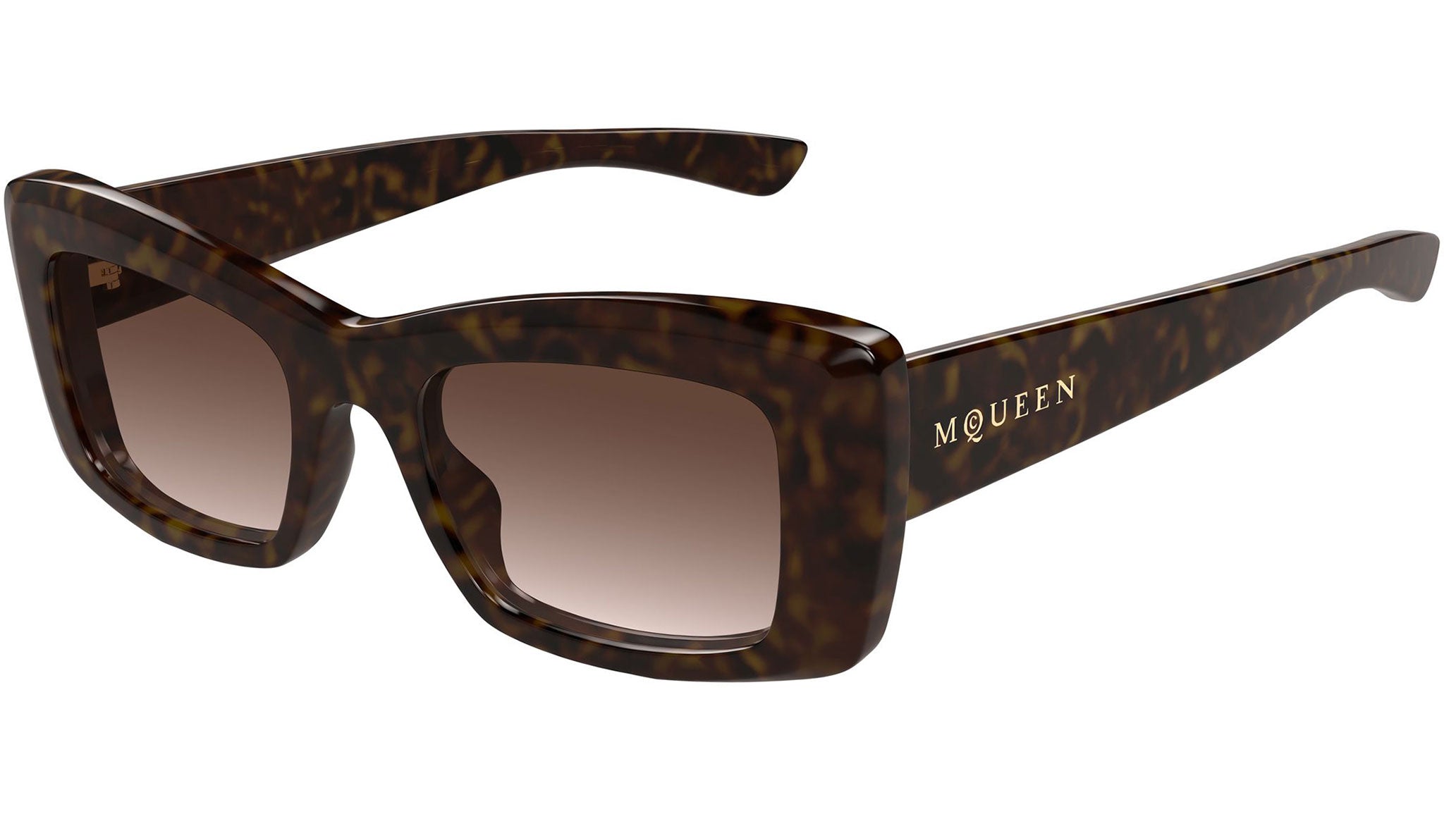 Occhiali da sole Alexander McQueen Logo modello AM0526S in acetato riciclato rettangolari codice colore 002 avana scuro lucido con aste avana e lenti color marrone sfumato. Rivenditore autorizzato Alexander McQueen online. Gli occhiali vengono consegnati con custodia e accessori originali e sono coperti dalla garanzia ufficiale di 12 mesi del produttore.
