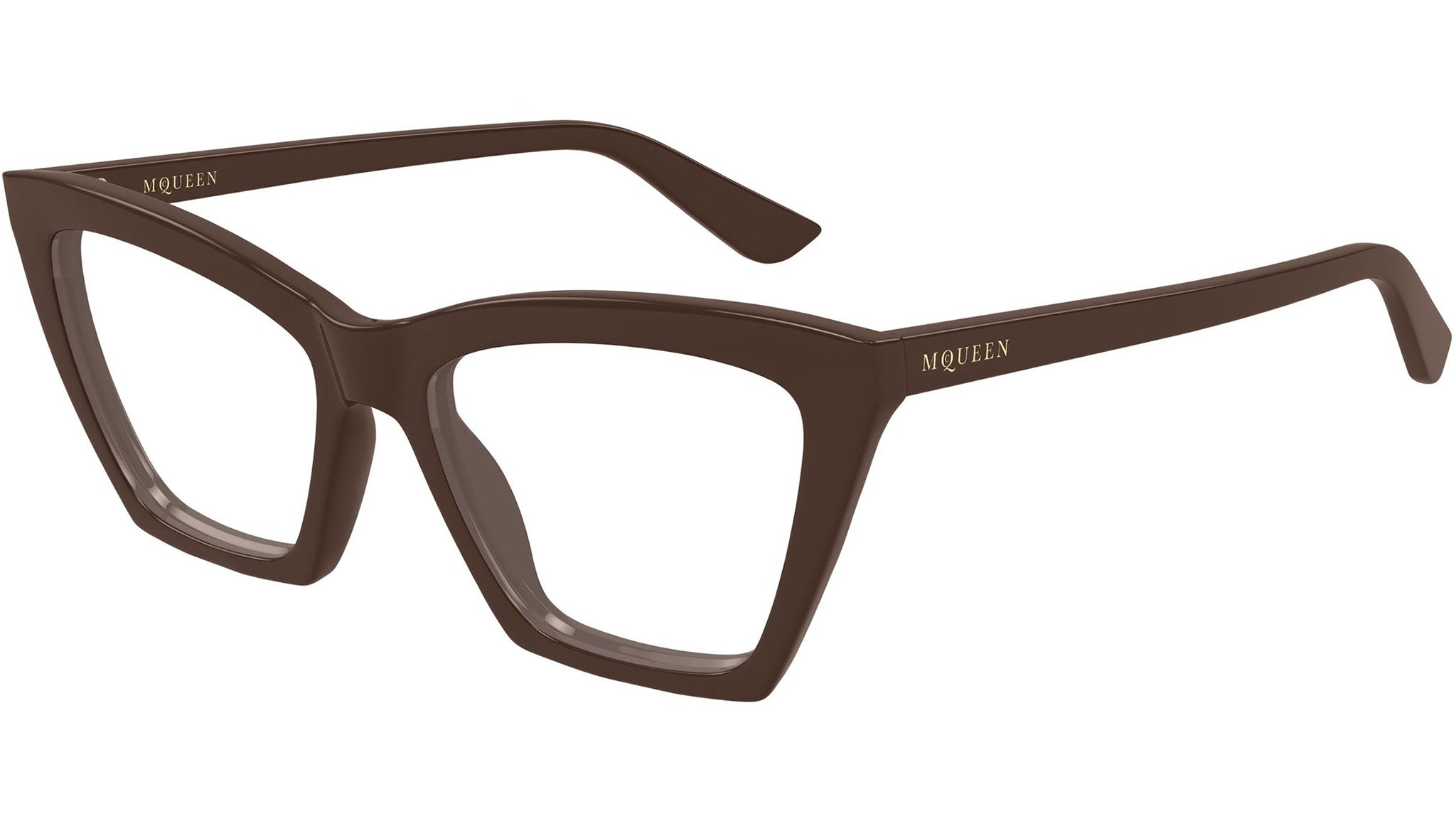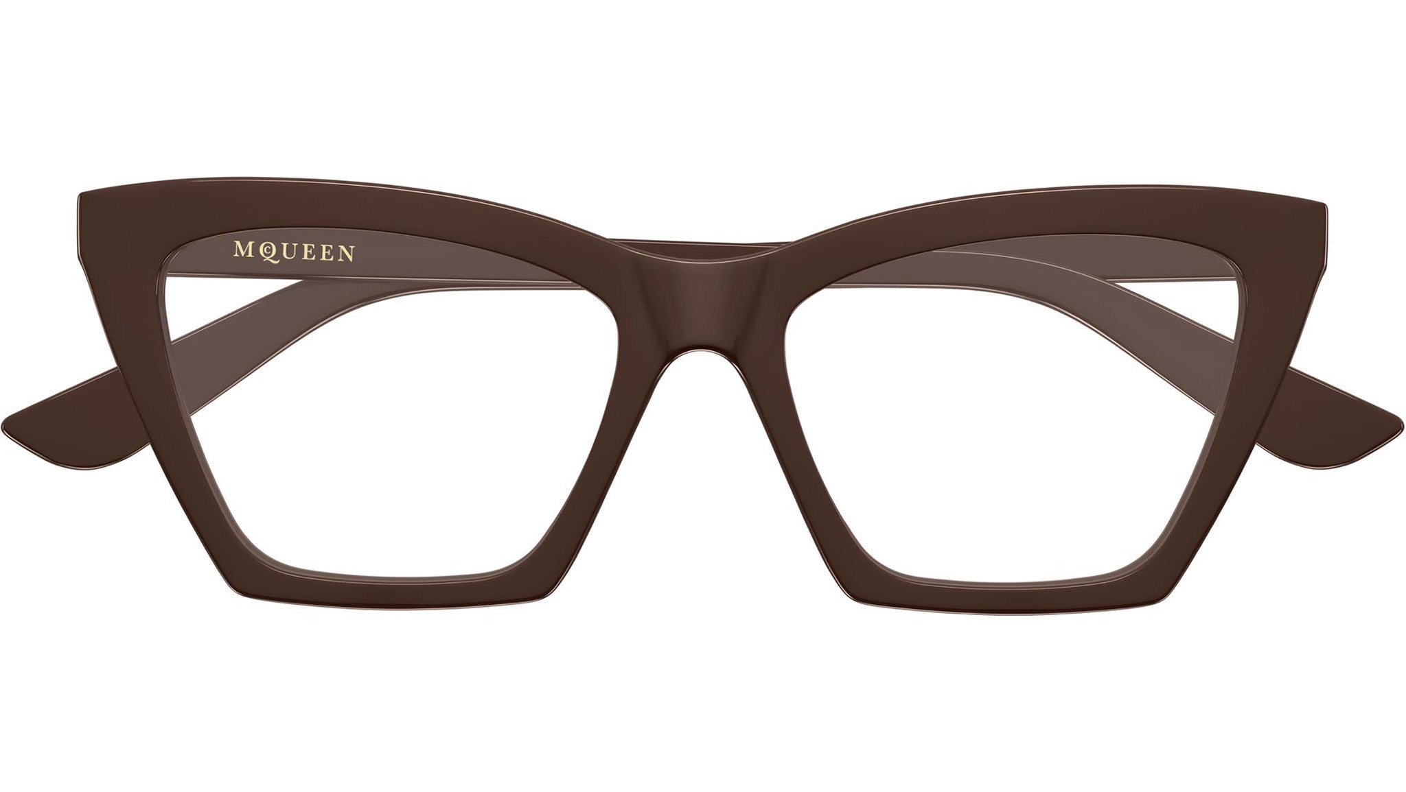 Occhiali da vista Alexander McQueen Logo modello AM0536O in acetato riciclato cat eye codice colore 003 marrone lucido tinta unita con aste marrone e lenti demo. Rivenditore autorizzato Alexander McQueen online. Gli occhiali vengono consegnati con custodia e accessori originali e sono coperti dalla garanzia ufficiale di 12 mesi del produttore.