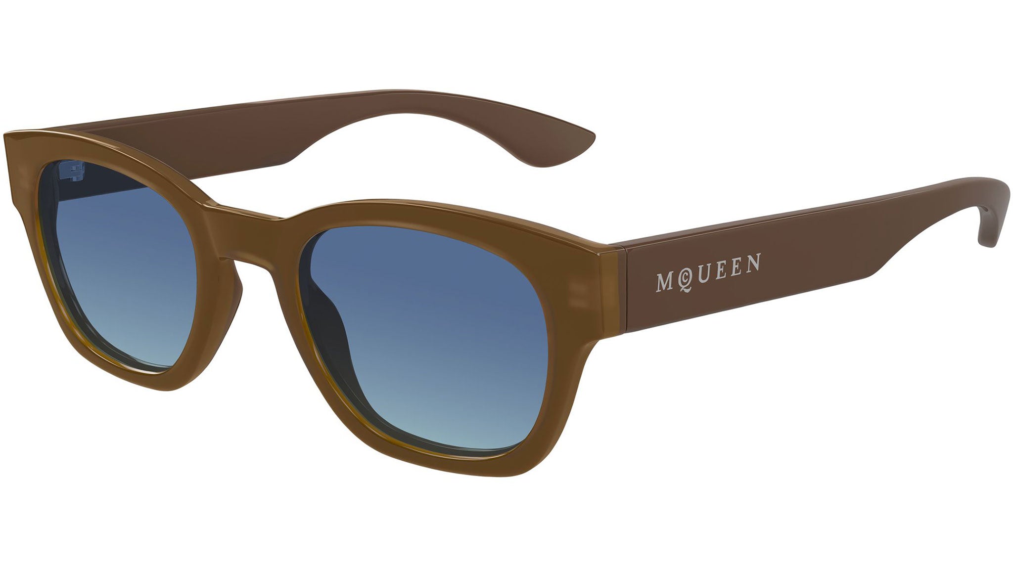 Occhiali da vista Alexander McQueen Logo modello AM0530S in acetato riciclato panthos codice colore 003 marrone miele bilayer marrone solido con aste marrone e blu scuro sfumato blu chiaro. Rivenditore autorizzato Alexander McQueen online. Gli occhiali vengono consegnati con custodia e accessori originali e sono coperti dalla garanzia ufficiale di 12 mesi del produttore.
