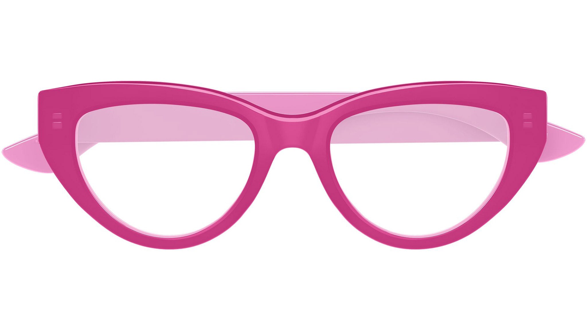Occhiali da vista Alexander McQueen Logo modello AM0529O in acetato riciclato cat eye codice colore 004 rosa opalino bilayer rosa solido con aste rosa e lenti demo. Rivenditore autorizzato Alexander McQueen online. Gli occhiali vengono consegnati con custodia e accessori originali e sono coperti dalla garanzia ufficiale di 12 mesi del produttore.