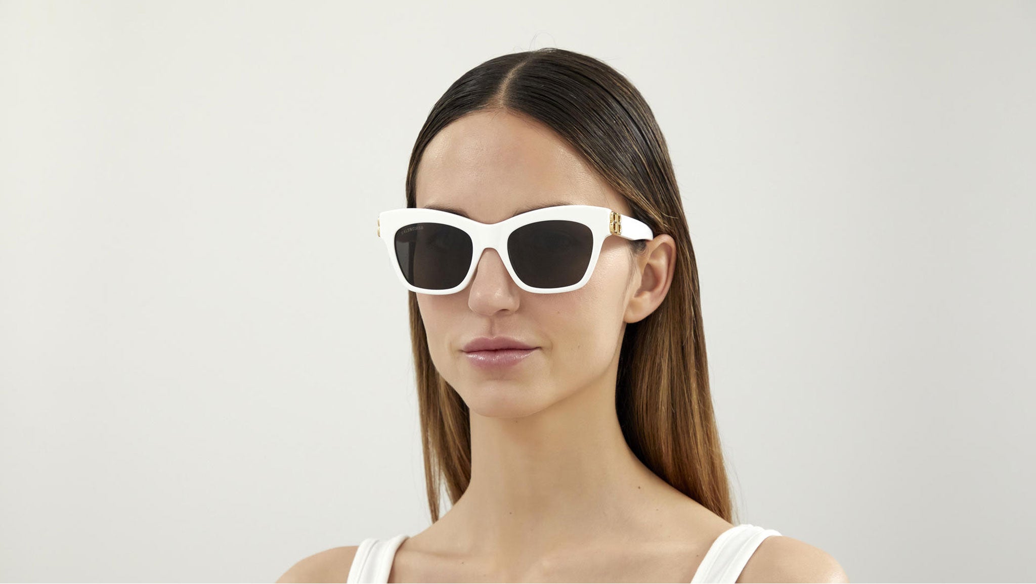 Occhiali da sole Balenciaga linea Everyday modello BB0132S 006, variante colore bianco tinta unita lucido con lenti color grigio tinta unita.