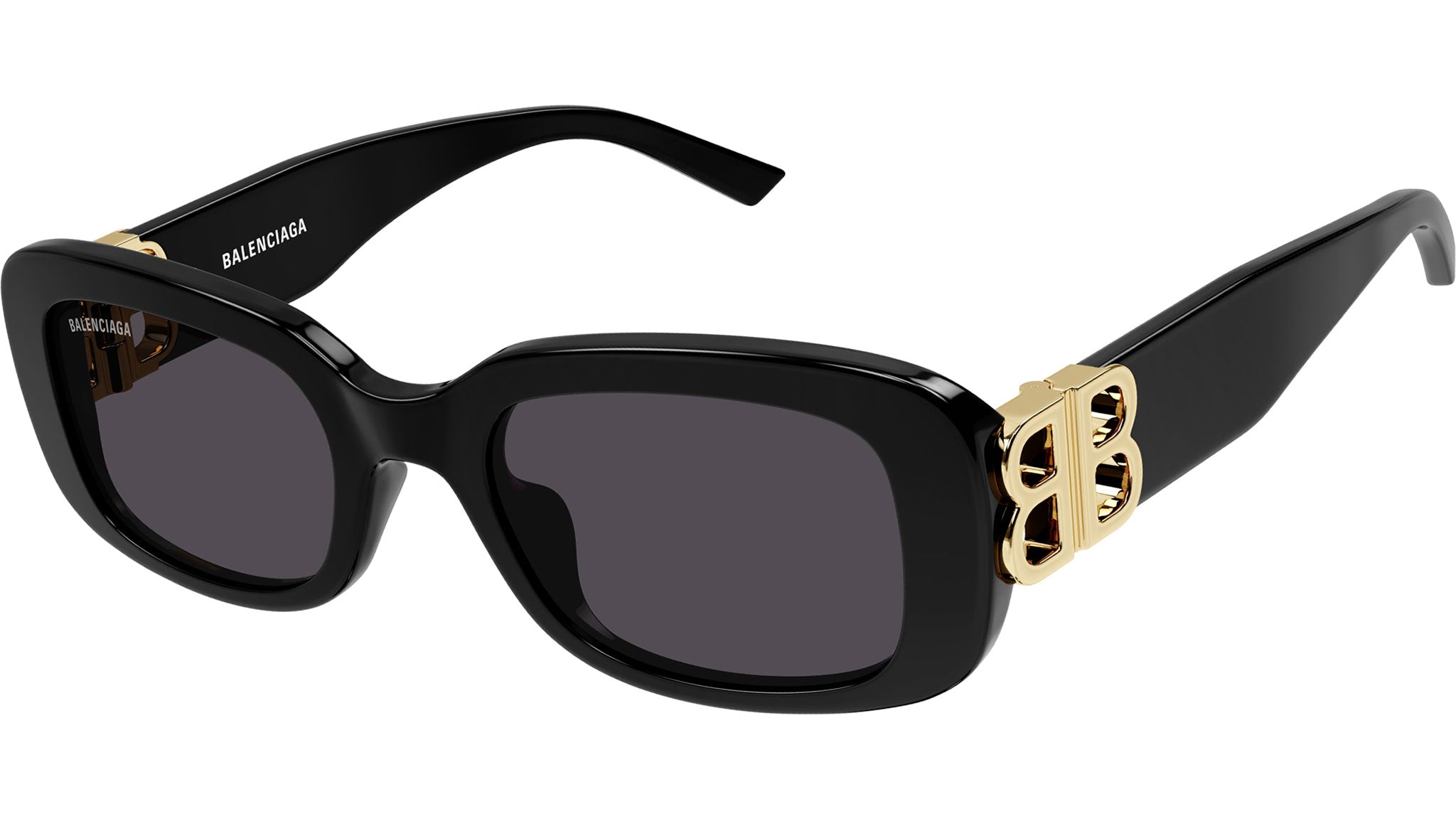 Occhiali da sole Balenciaga modello BB0310SK linea Everyday codice colore 001 nero lucido tinta unita in acetato riciclato forma rectangle con lenti color grigio tinta unita.