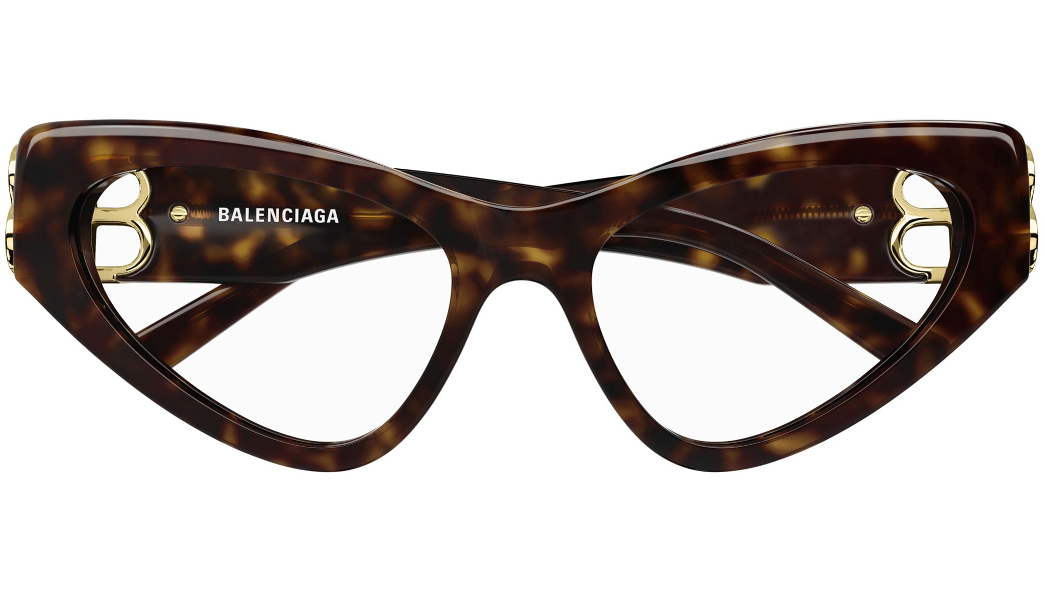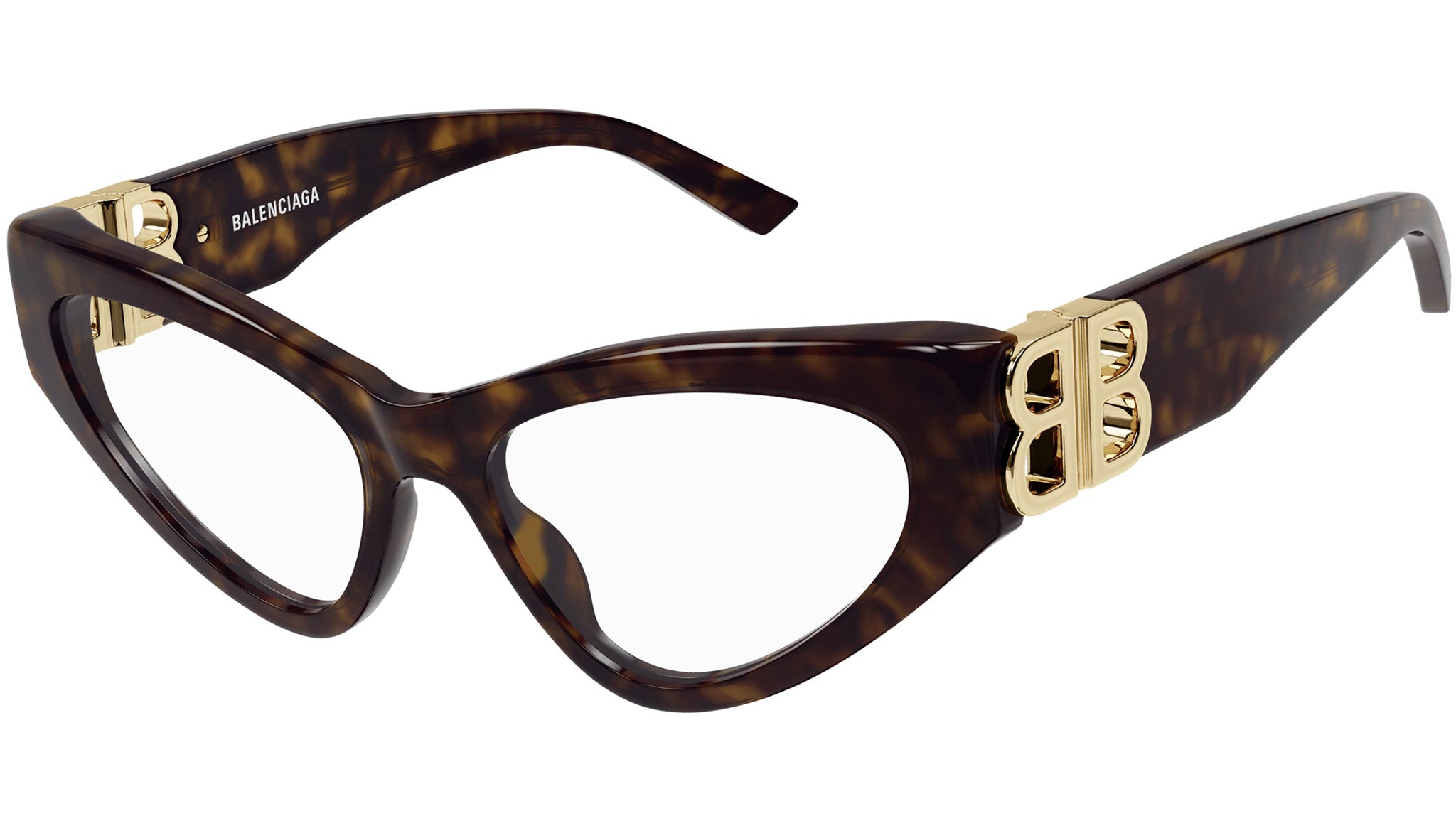 Occhiali da vista Balenciaga modello BB0313O linea Everyday codice colore 002 tartaruga scuro lucido in acetato riciclato forma cat eye con aste color tartaruga.