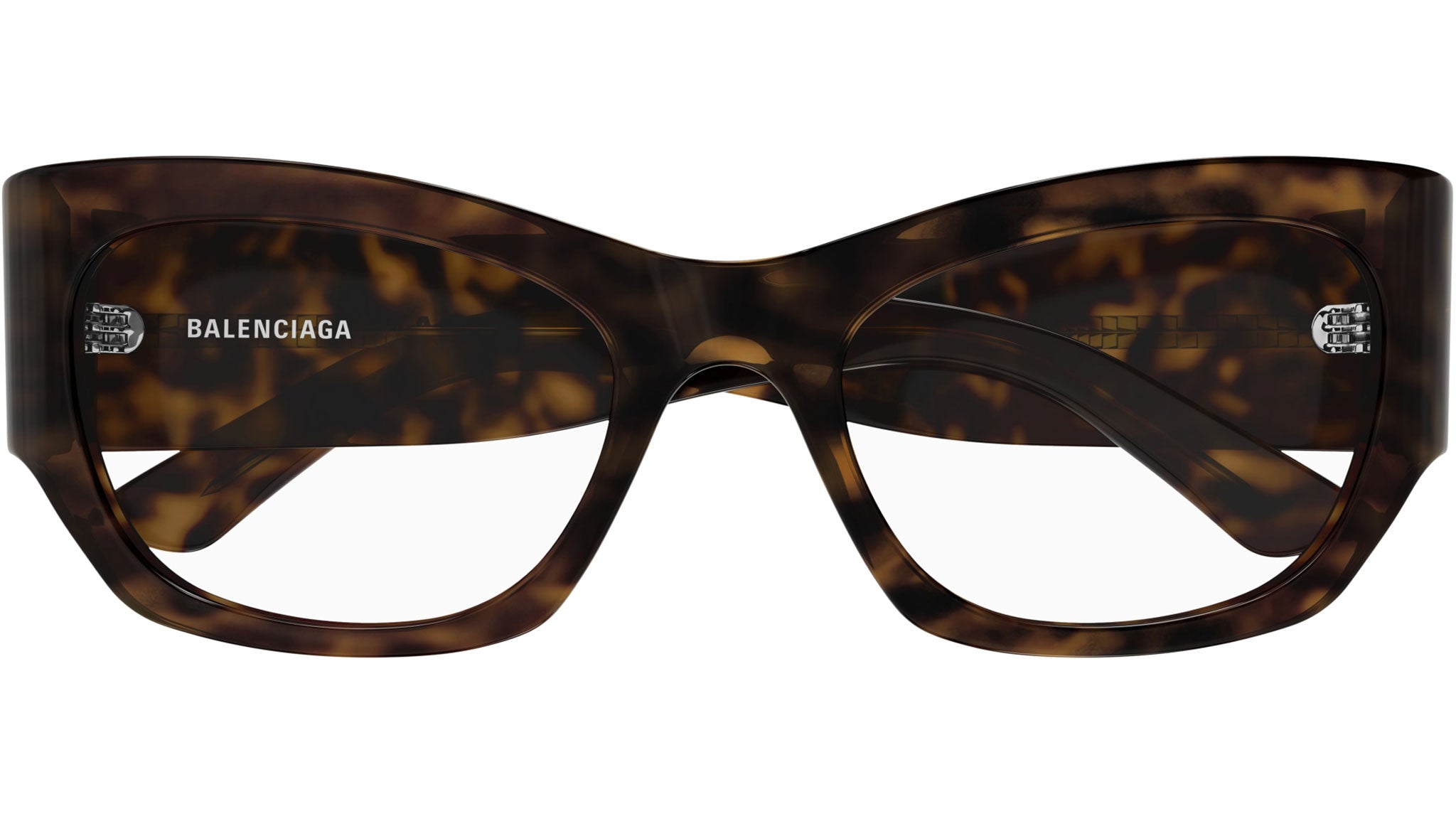 Occhiali da vista Balenciaga modello BB0333O linea Everyday codice colore 002 tartaruga scuro lucido in acetato riciclato forma cat eye con aste color tartaruga.