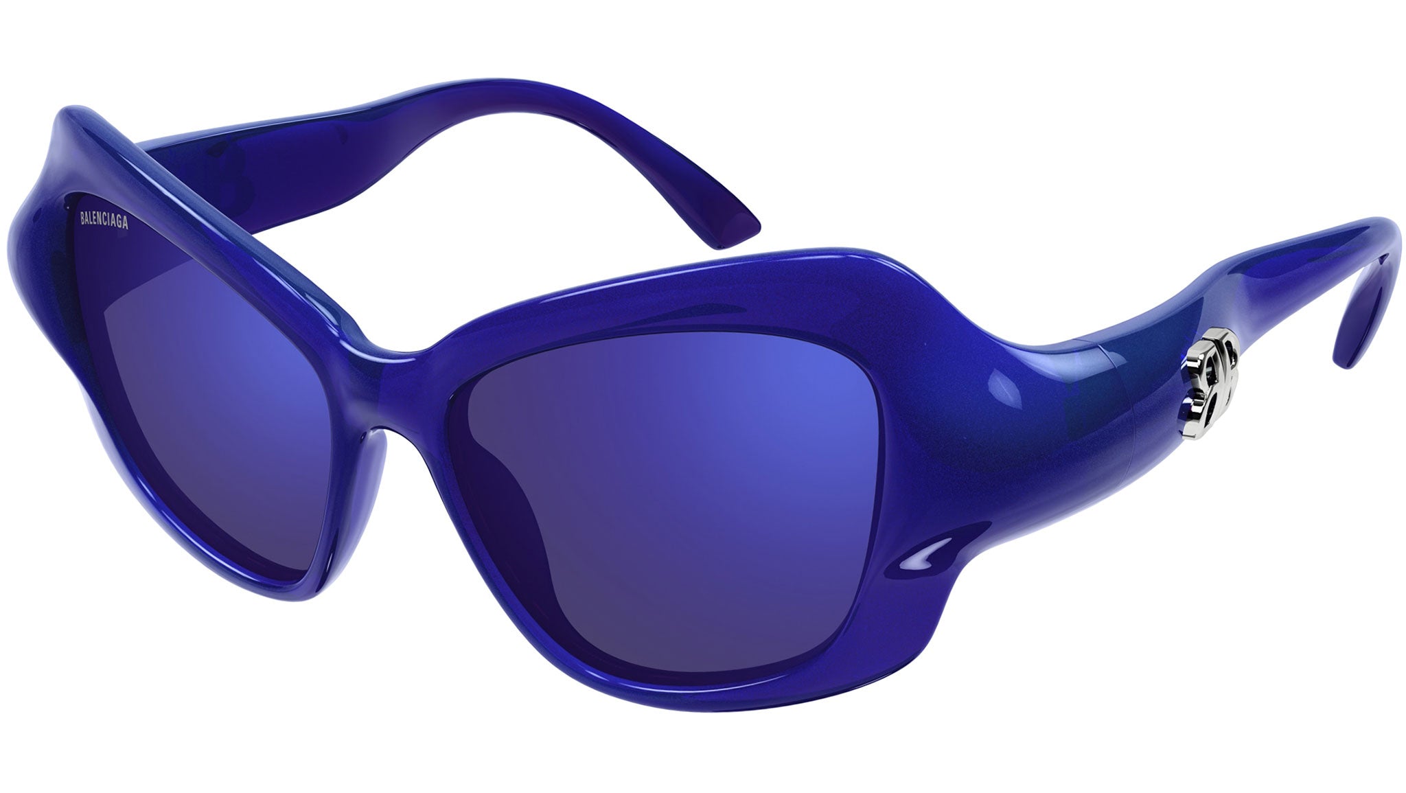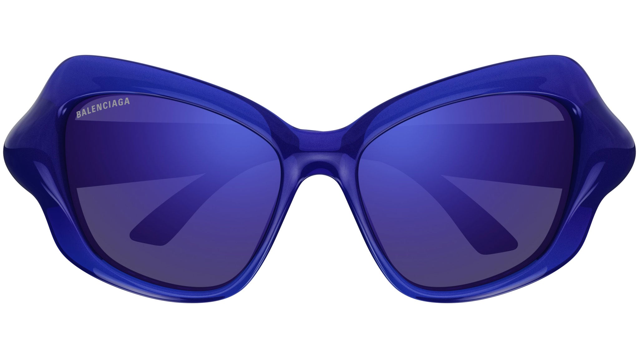 Occhiali da sole Balenciaga modello BB0353S linea Everyday codice colore 004 blu brillante trasparente con rosa iridescente in injection forma a gatto con aste color blu e lenti color blu solido + viola multistrato. Rivenditore autorizzato Balenciaga online. Gli occhiali vengono consegnati con custodia e accessori originali e sono coperti dalla garanzia ufficiale di 12 mesi del produttore.