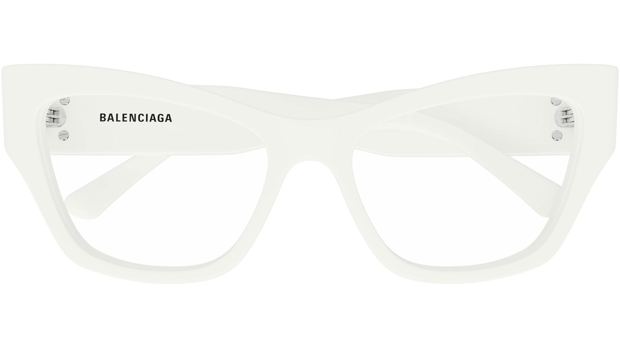 Occhiali da vista Balenciaga modello BB0362O linea Everyday codice colore 003 avorio tinta unita lucido in acetato riciclato forma a gatto con aste color bianco e lenti demo trasparenti. Rivenditore autorizzato Balenciaga online. Gli occhiali vengono consegnati con custodia e accessori originali e sono coperti dalla garanzia ufficiale di 12 mesi del produttore.